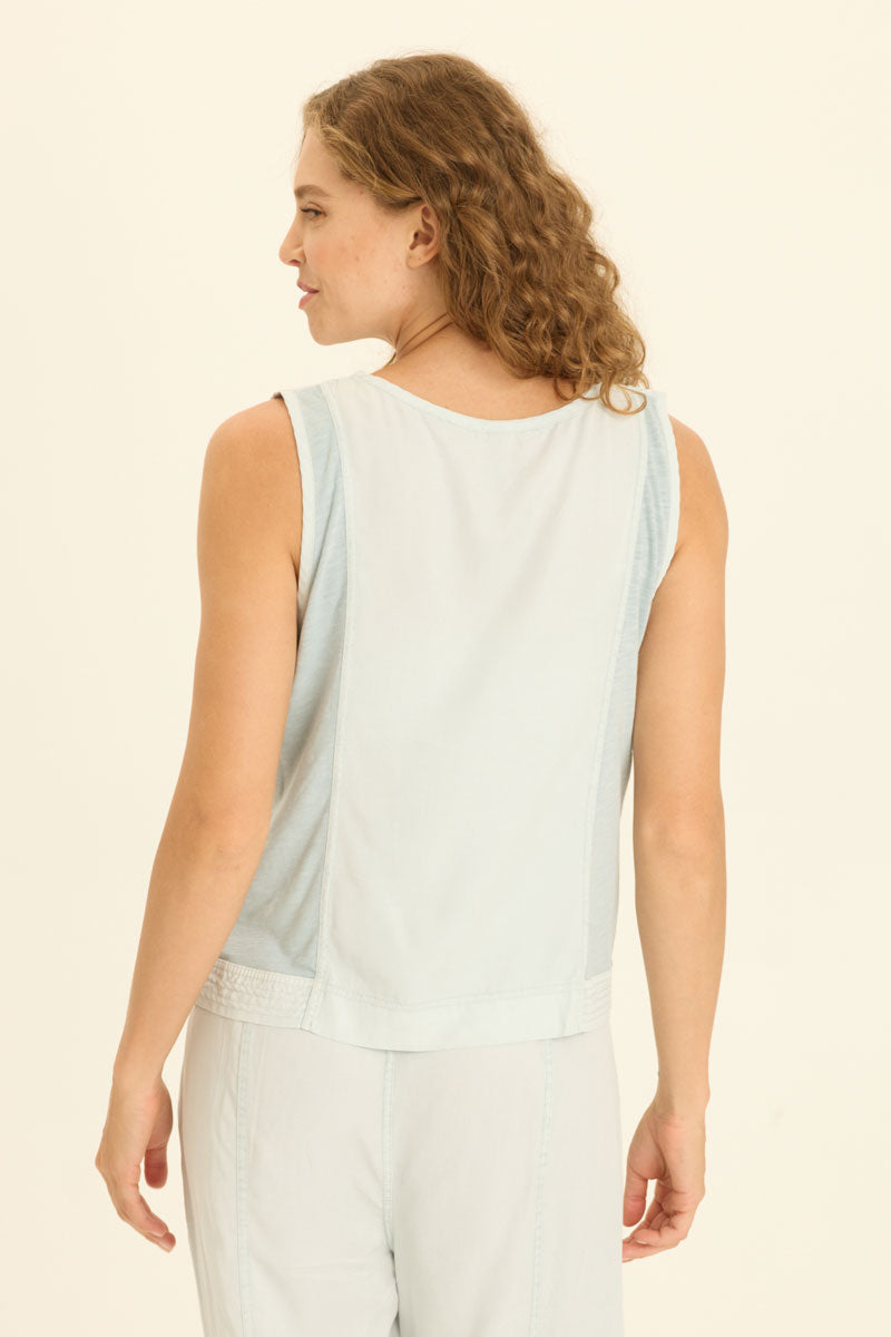 XCVI applies their signature mix of fabric and texture to the super-soft Davies Tank. This simple crew neck easy fit tank features contour seaming in front for added shape. Multi media panels in back make this sleeveless top interesting from all angles. Pair with the coordinating Mallis Gaucho and layer over the Gowen Sweater for a completely casual, yet polished look.