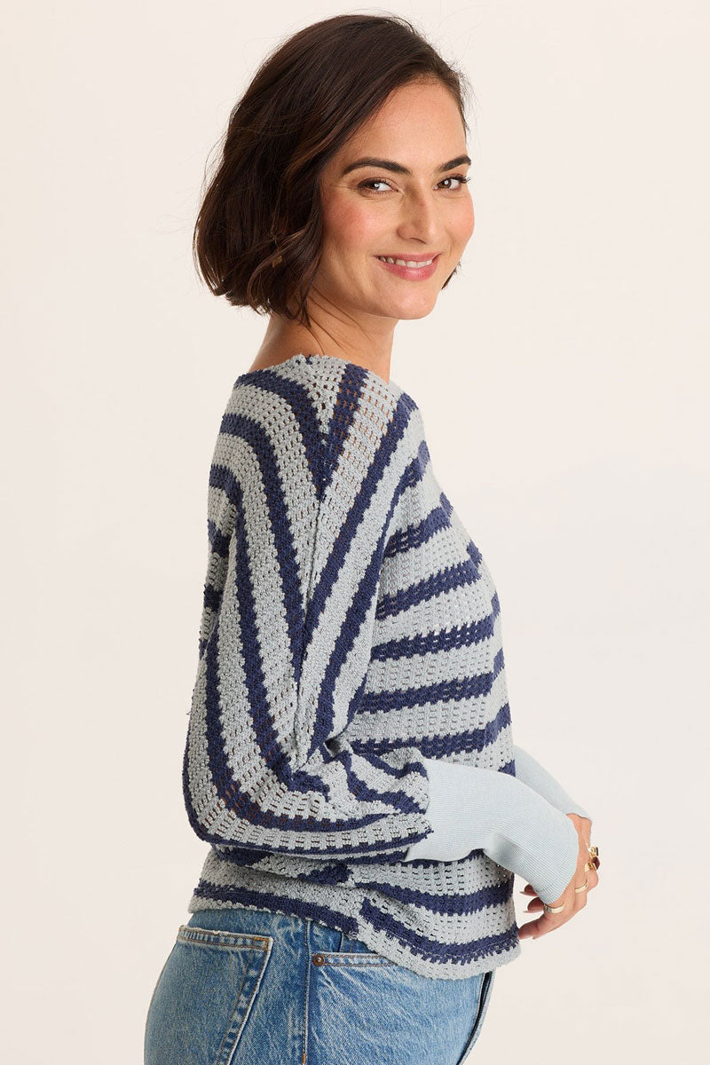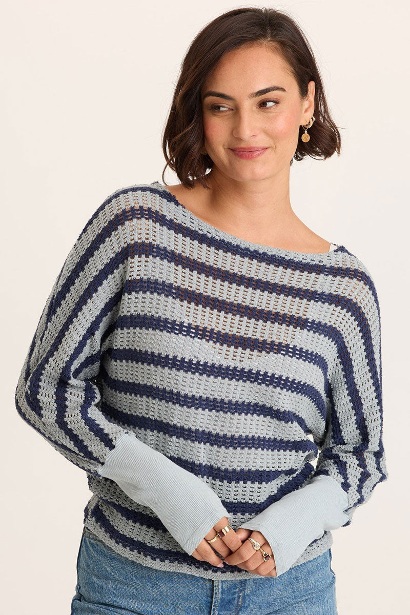 Relaxed and easy, the Gowen Sweater is inspired by nautical stripes. This mid-weight open-weave cotton knit features bold navy stripes and a kimono sleeve. It transitions beautifully from season to season with a resort: pair it with a long sleeve layering top & jean on cooler days, or with the coordinating Davies Tank & Mallis Gaucho for a resort-forward look.