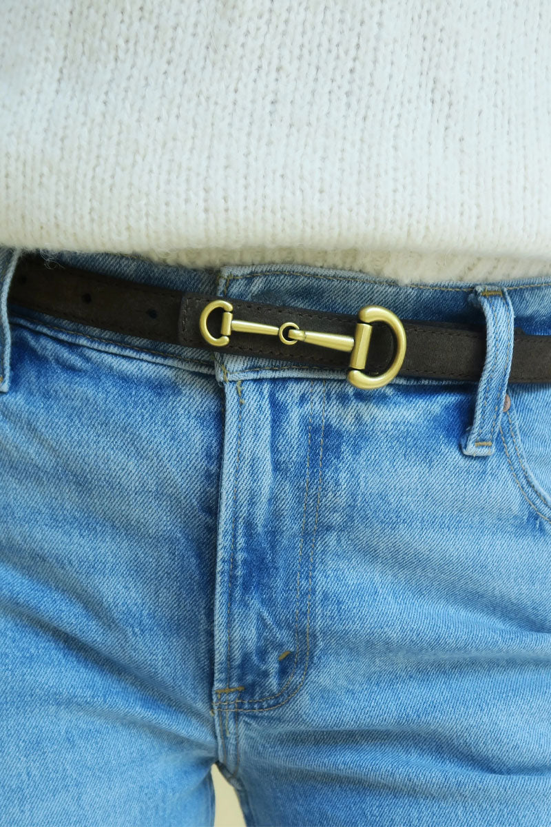 A timeless, slim belt with rich suede texture and polished gold hardware for a refined, everyday finish. Clean, classic, and effortlessly chic. Perfect for adding a subtle touch of luxury to denim or tailored looks.