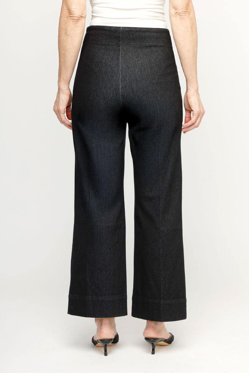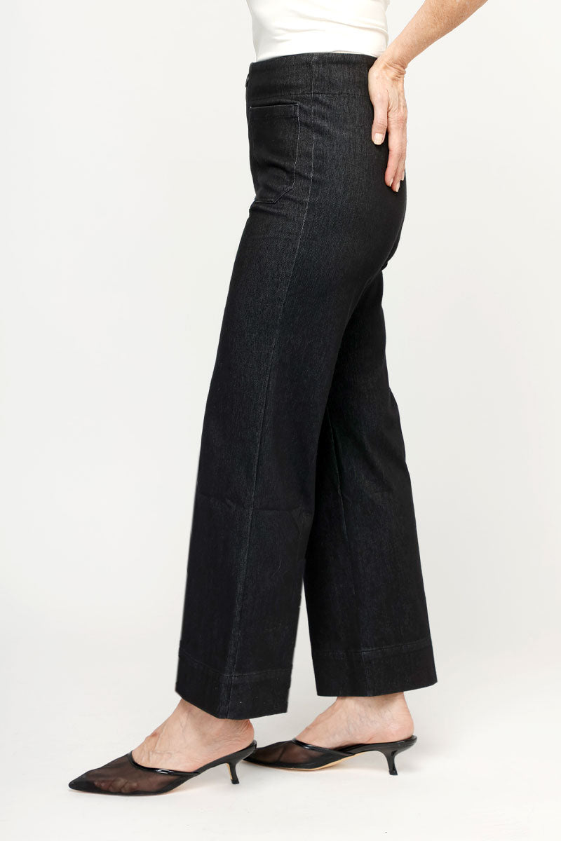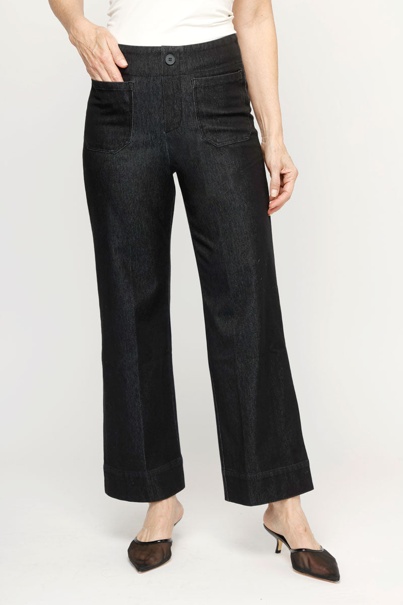 Our popular Lizzie is back in denim! The Lizzie pant embraces the wide-leg trend in a pant that fits and flatters as only a Holland Ave pant can. The Lizzie has the look of a trouser, but don't let the button detail and faux zipper fool you -- it's a pull-on pant! Perfectly placed pockets add a nautical, tailored vibe. And the leg? Not too wide, and not too slim, it sports just enough width to stay on-trend in style and comfort. It holds its shape through the hip and rear without bagging or sagging.