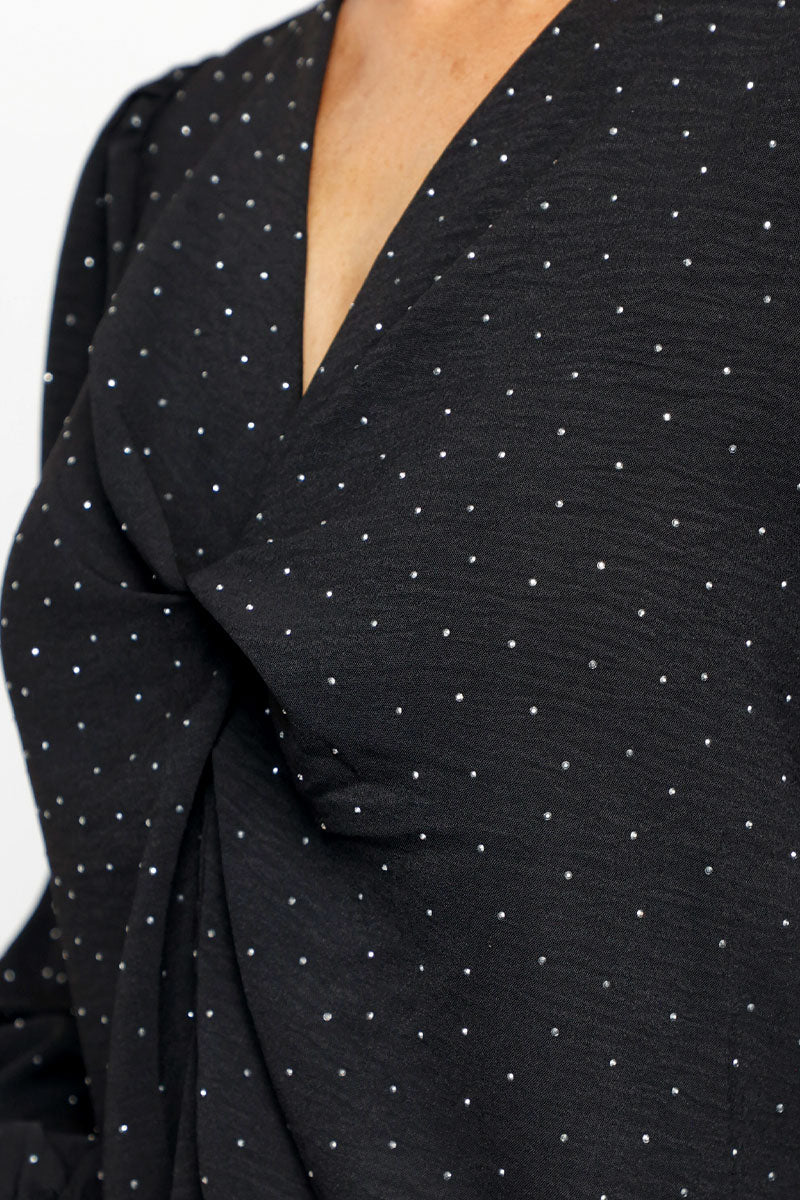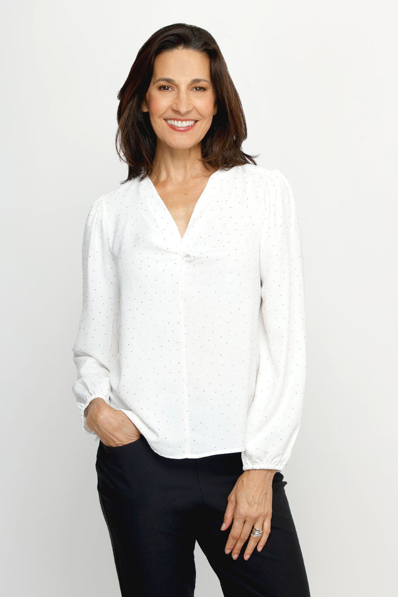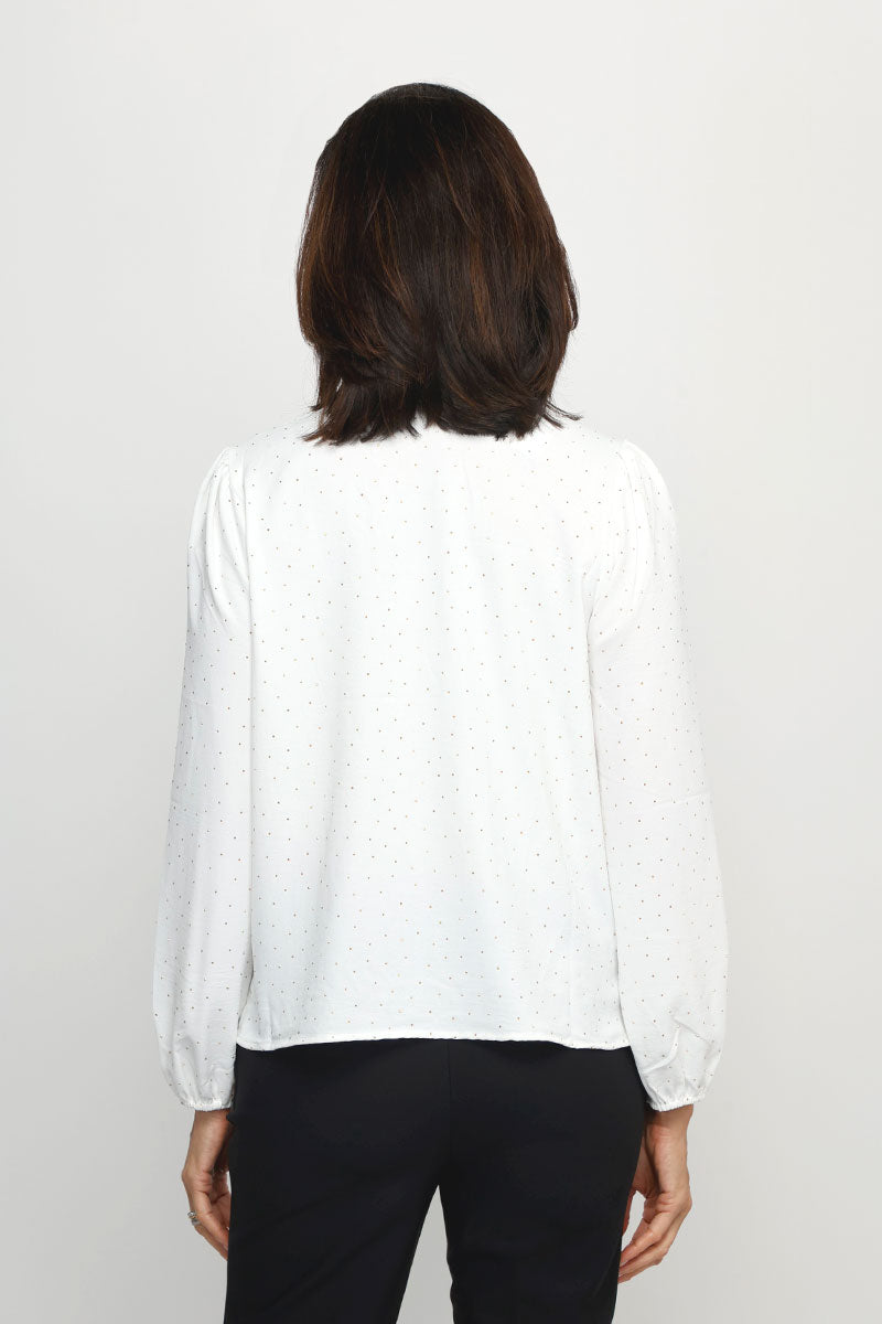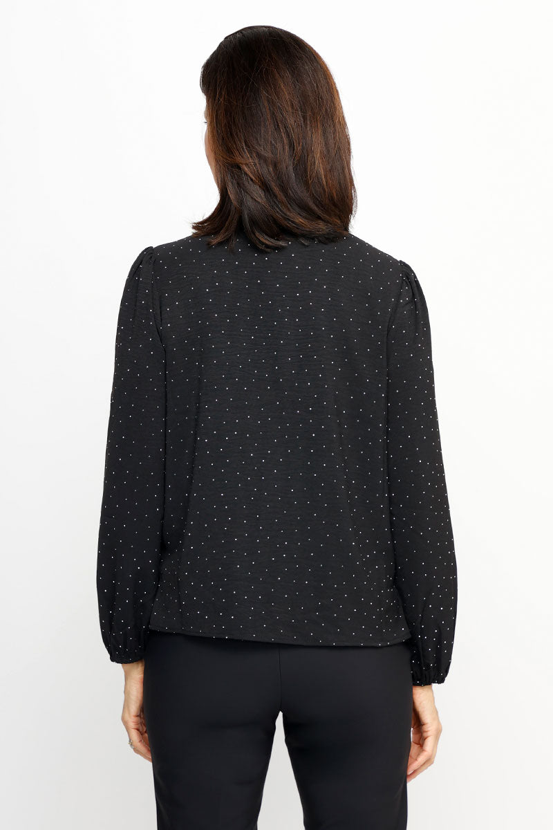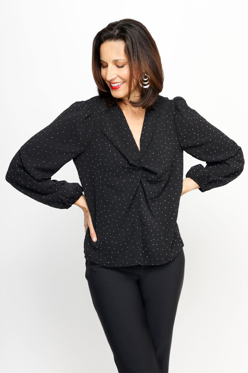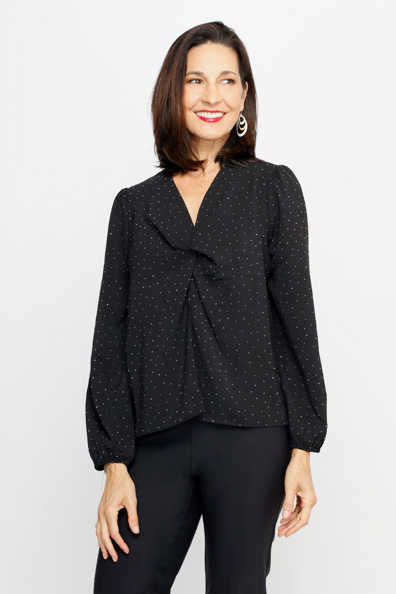 Airflow is back and getting a bit dressed up! Tiny glowing metallic studs are sprinkled onto our signature lightly textured Airflow, adding a touch of elegance and shine to this simple v neck pullover. Twist detail below the neckline elevates the look.