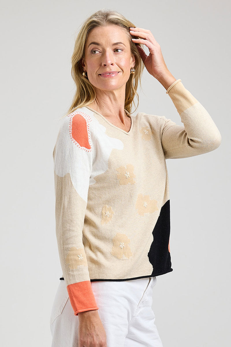• Contrast color intarsia lilies and flowers on front and sleeves