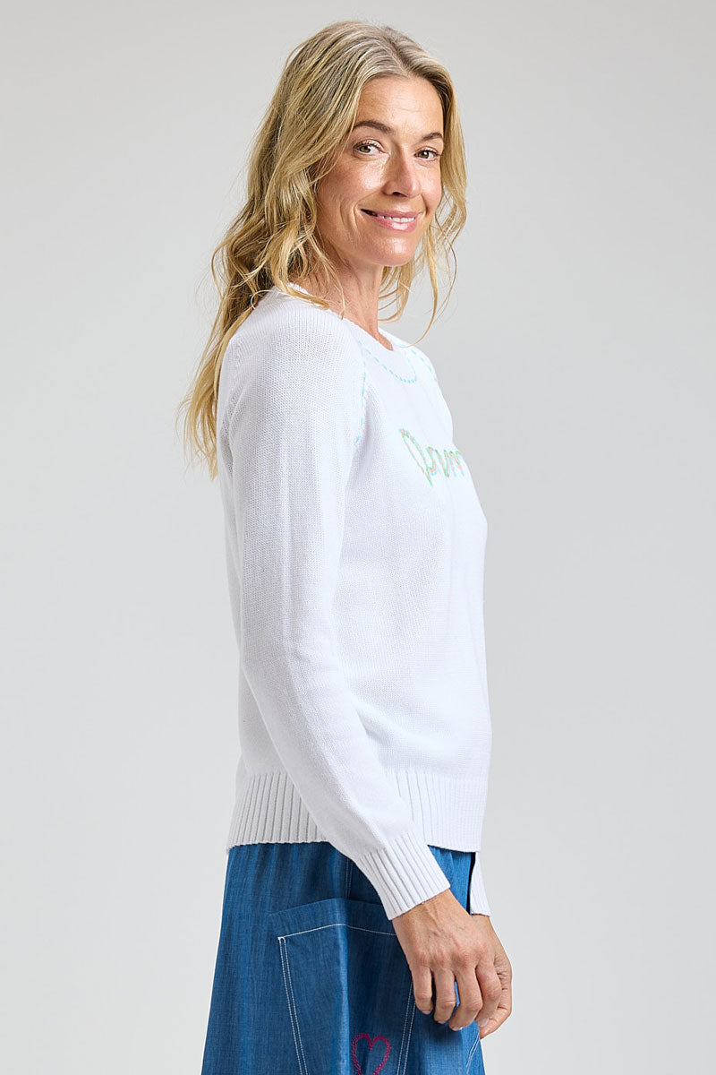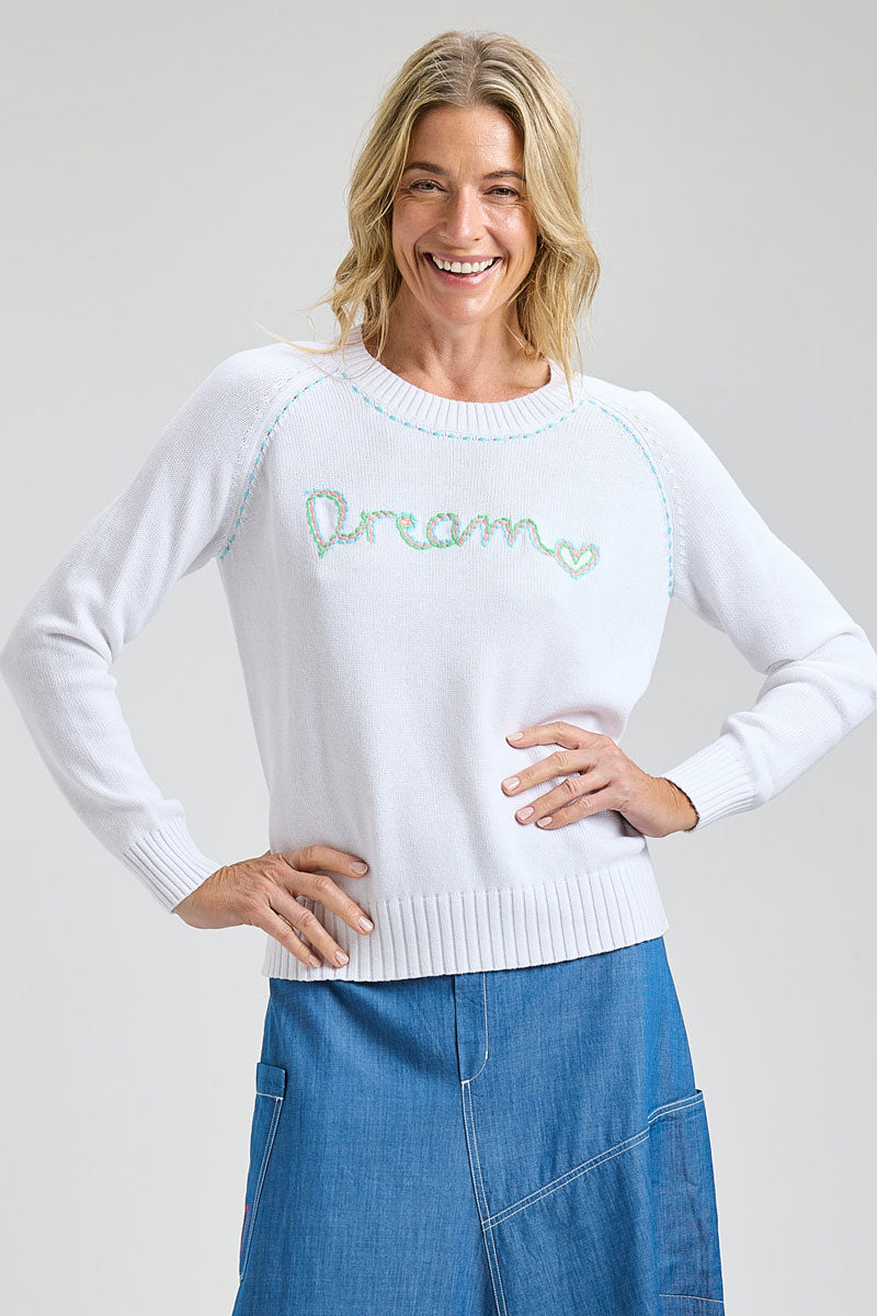 A timeless staple with a modern twist, the Let's Dream Sweater is a classic cotton crew sweater that's anything but ordinary. Featuring charming hand-embroidered stitch details in vibrant hues, it's the perfect piece to add personality to your everyday rotation. Crafted from mid-weight 100% cotton, it's soft enough for all-day wear while the colorful embroidered messaging keeps things fresh and on-trend.