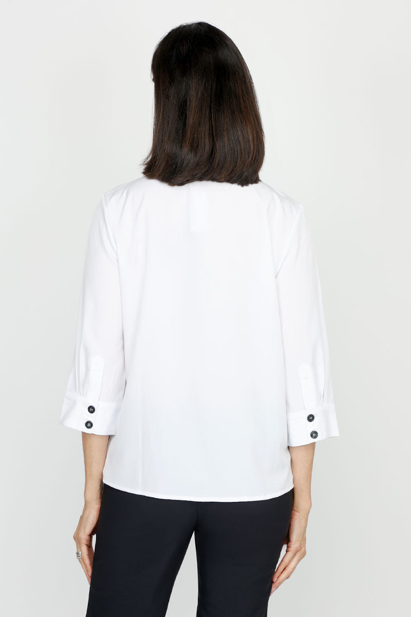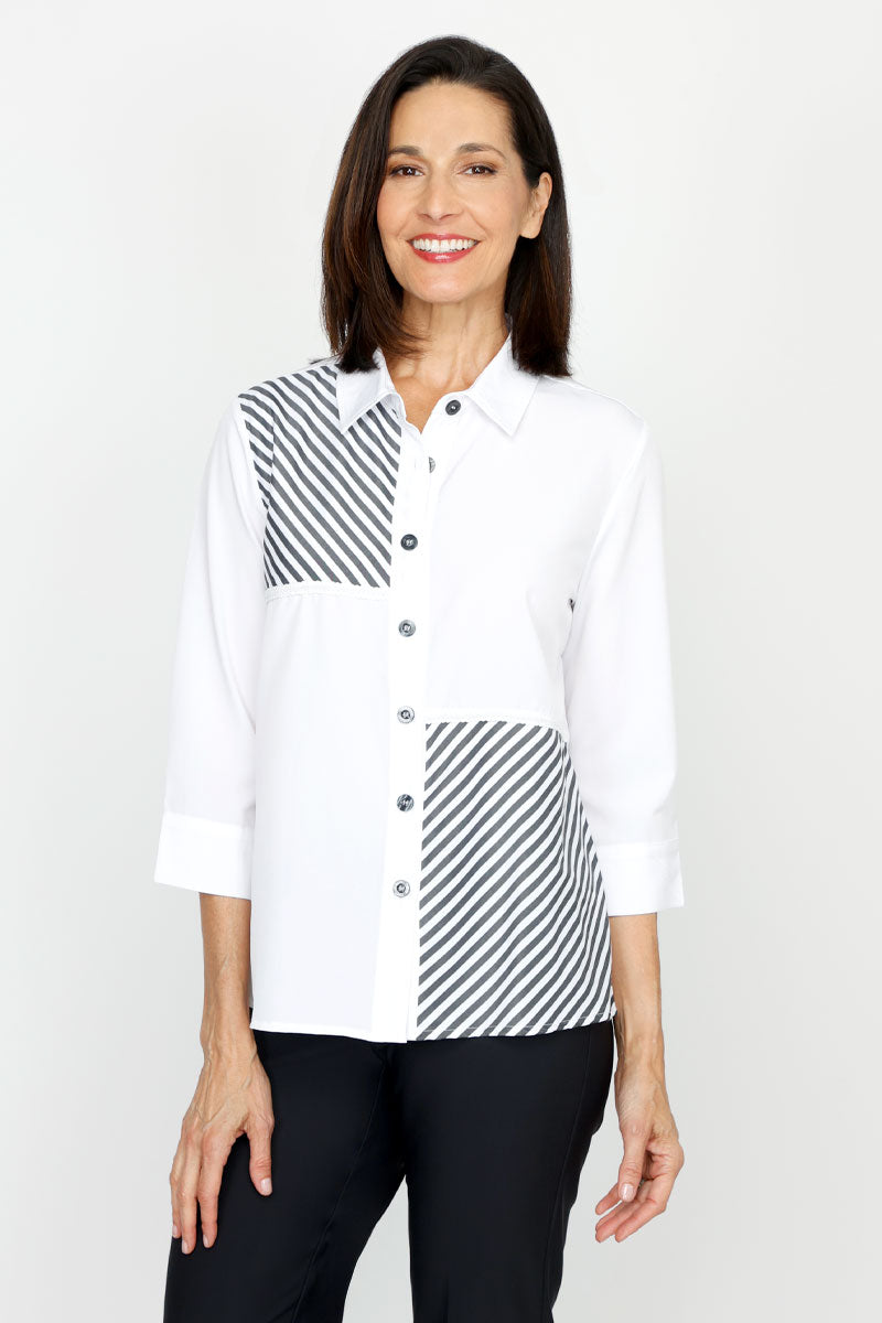 The white blouse gets a new look in the Striped Square Blocks Blouse. This sleek, silky blouse features bold black and white diagonal stripes in striking square blocks that instantly elevate any everyday look. The relaxed fit and three-quarter sleeves offer all-day comfort, while the classic button-down front keeps things polished and put-together. Perfect for mixing with your favorite jeans or dressing up for something special.