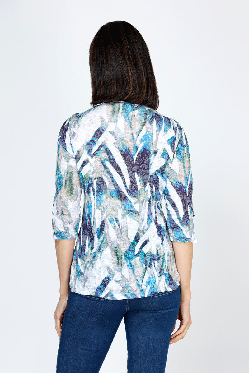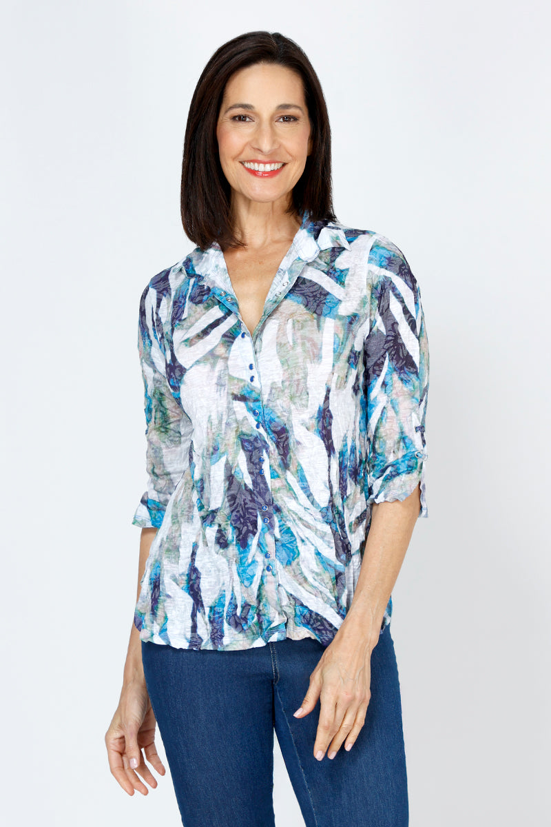 The Watercolor Stripes Snap Front Top is the ideal mash-up of a blouse and a lightweight top! This ultra-soft and simple-shaped piece is effortless to wear and just as effortless to put on, thanks to the decorative front snaps. Fashioned from no iron crinkle fabric and featuring an arty colorful splash print, it's figure flattering and the perfect go-to for any season – effortlessly chic and oh-so comfy!