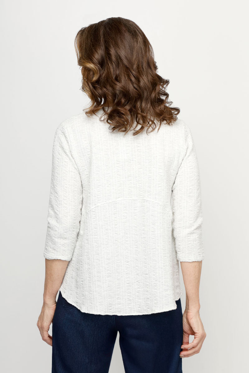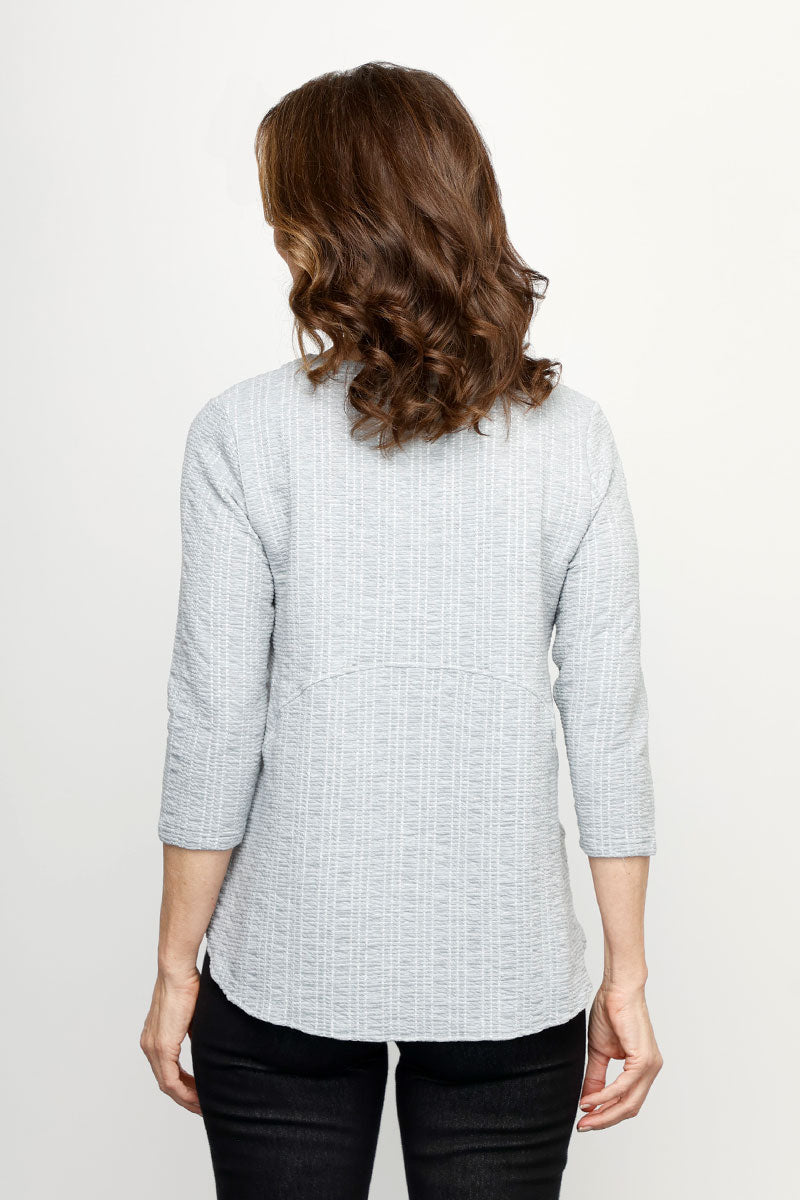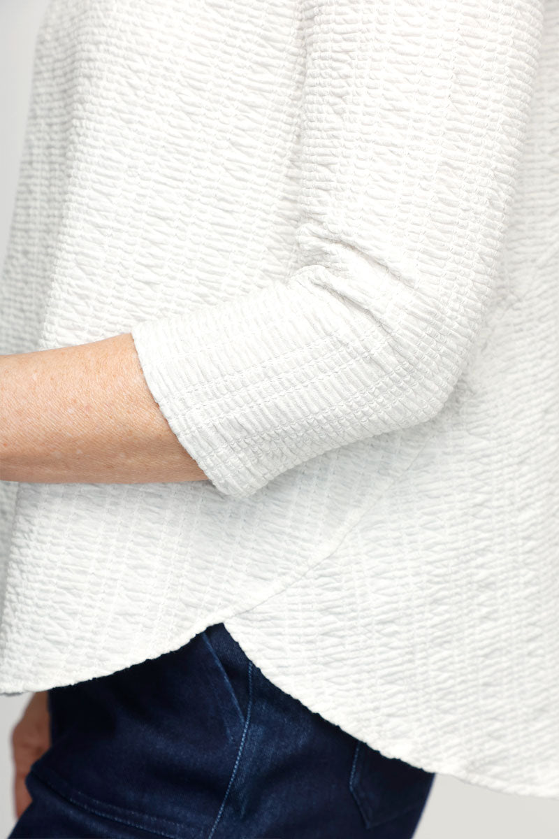 Texture takes center stage in this playful update to the timeless crew neck! Crafted from a softly puckered fabric that resists wrinkles, this 3/4 sleeve tee keeps you looking polished from morning to night. Curved back seaming flows to the front, creating a flattering high-low hem and gentle A-line shape that moves with you. Relaxed, comfortable, and endlessly wearable—throw it on and go.