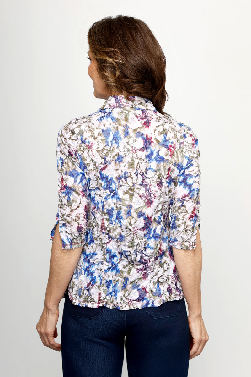 New crinkle print alert! The Watercolor Snap Front Shirt is the perfect combination of a blouse and a lightweight crinkle top. This ultra-soft, easy-to-wear top is perfect for year-round wear. The decorative front snaps make it so easy to put on. Its casual, simple shape, comfortable fit and crinkle fabric make it a great choice for any day or time.