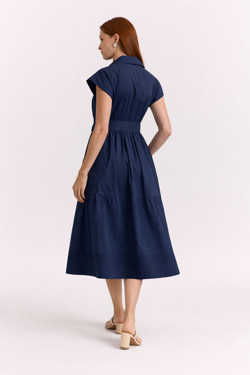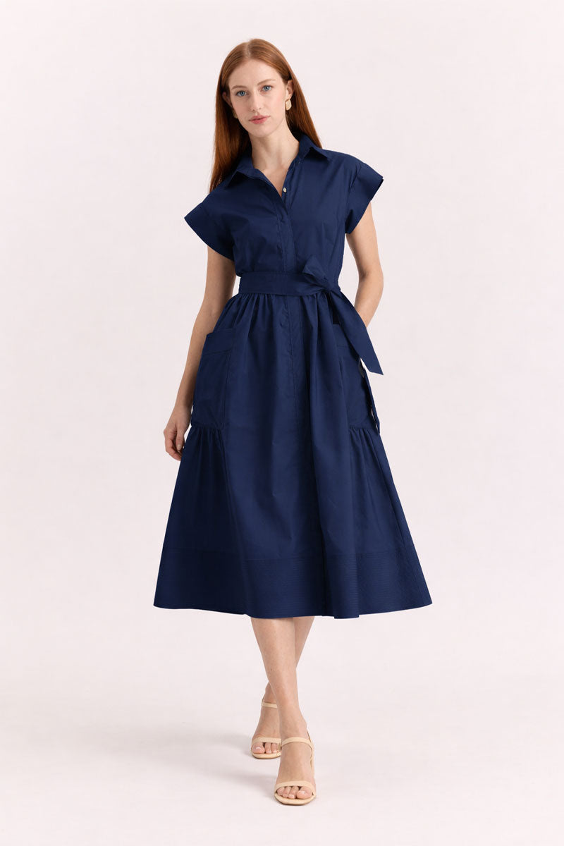 The Annabelle Short Sleeve Dress exemplifies refined tailoring with its elegant fit-and-flare silhouette. Crafted from a sophisticated cotton, polyester, and spandex blend, this shirt dress delivers exceptional comfort alongside graceful movement. Distinguished by a hidden button placket, trapunto stitched hem and oversized pockets that create a tiered effect, the design showcases meticulous construction. Dolman short sleeves provide an effortless drape, while the included fabric belt offers versatile styling options for any occasion.
