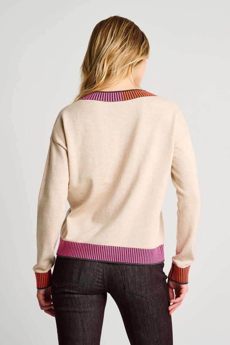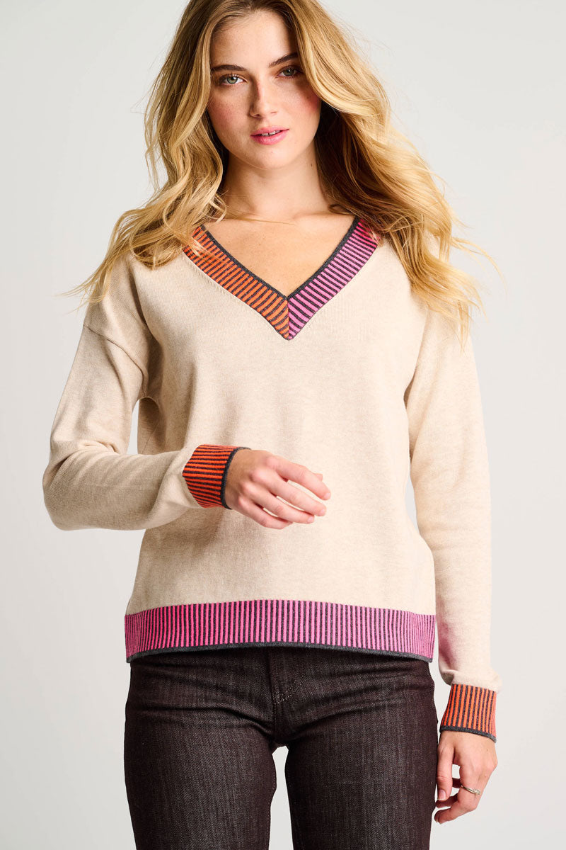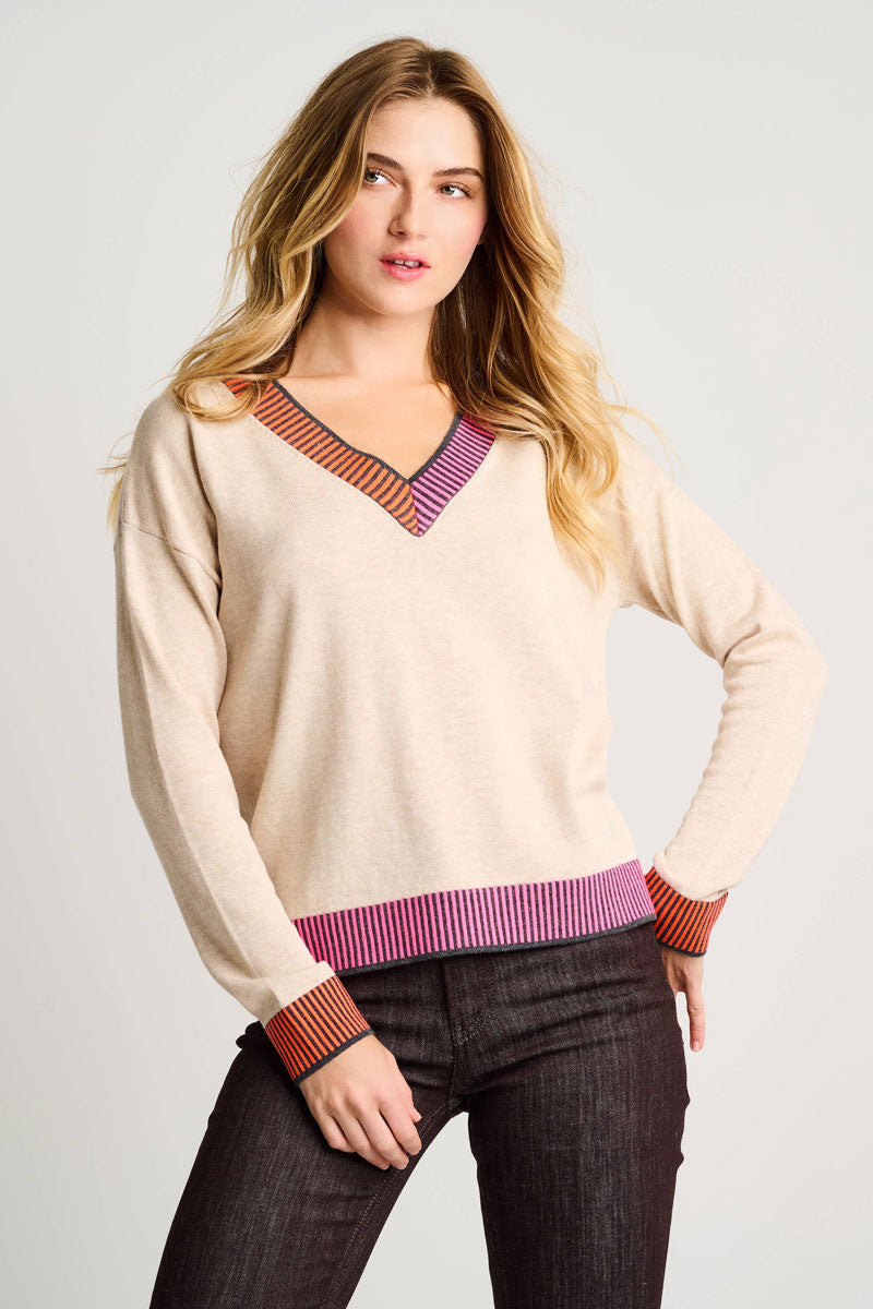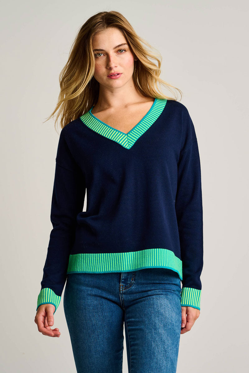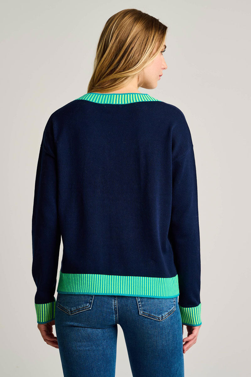 Classic and bold, the Ribbed & Ready Sweater is all about the contrast color detail.   This soft v-neck cotton knit layers colorful 2 tone trim at the neck, cuff and hem instead of the traditional ribbing.  Unexpected and classic at the same time, it's lots of fun to wear - and it's relaxed and comfortable.