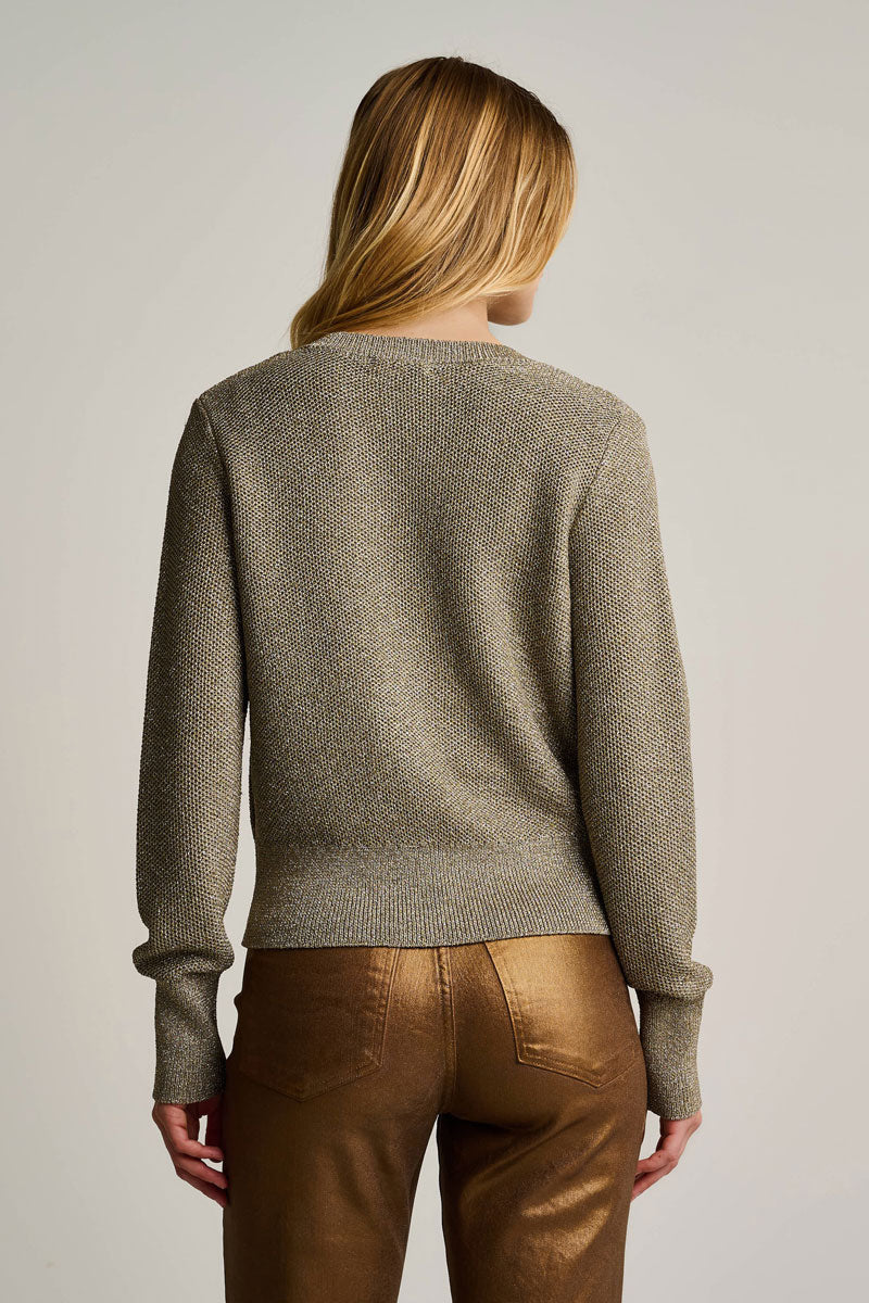A glittering gold metallic with a woven texture, the Star Shine Sweater is polished and classic.  Rhinestone star buttons add additional sparkle and sophistication to this refined cardigan.  Featuring a notched v neck, this is a knit that can take you anywhere this holiday season.  Paired with a silky pant, or classic denim it has a special glow all its own.