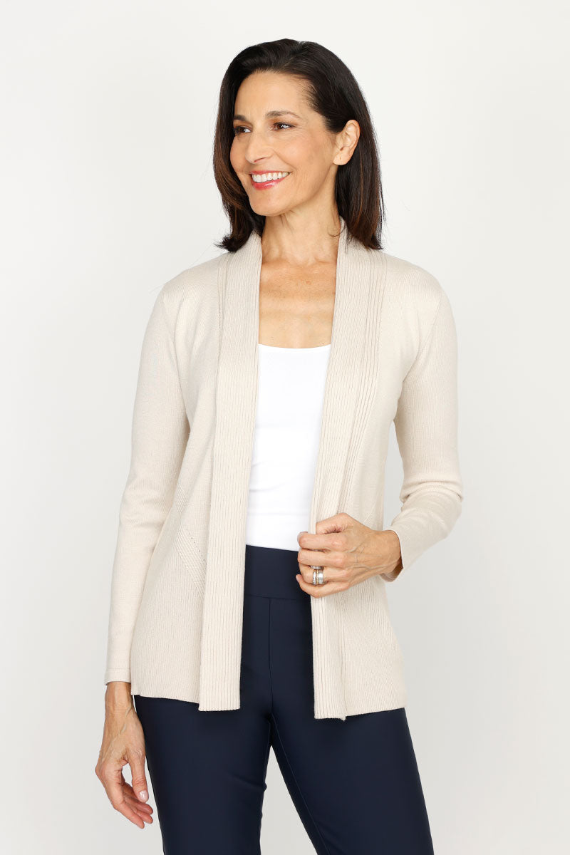 The perfect go-to topper, this open front cardigan is expertly designed to flatter. The rib detail on the folded shawl collar wraps you in cuddly softness. It's a great extra piece to help transition to cooler weather with coverage that's always in style.