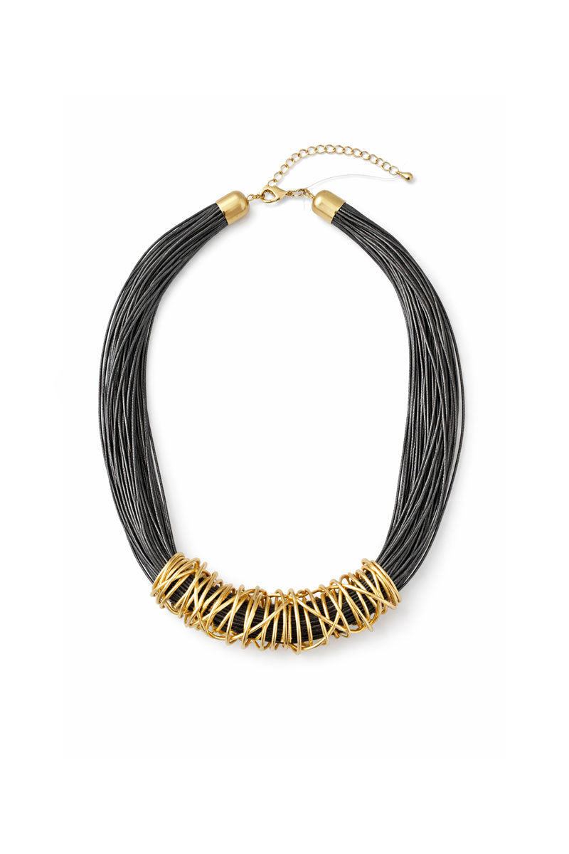 A bold, sculptural necklace that layers sleek strands with an artful gold wire accent for a modern, statement look. Designed to feel polished yet expressive, the Wire Twist Cord Necklace brings instant impact to simple tops and dresses.