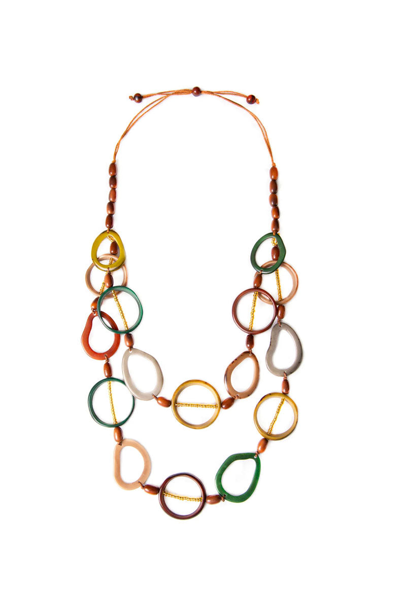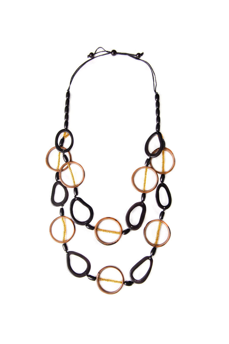 Made from natural materials, this two-layer necklace features open ring and organic oval shapes for a modern, sculptural look. Lightweight and eye-catching, it drapes effortlessly to add dimension and style to any outfit. A bold statement piece with an artisan touch.