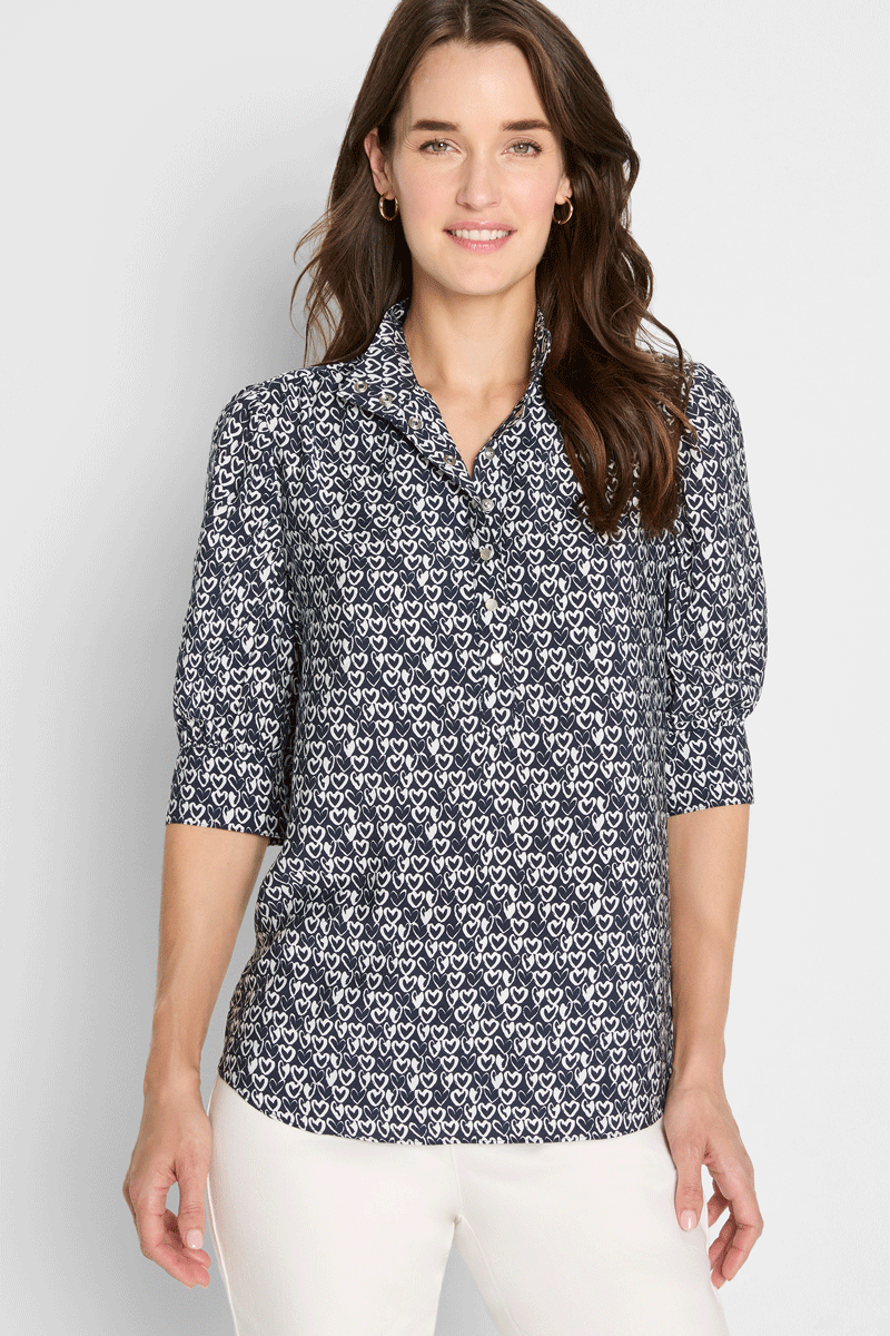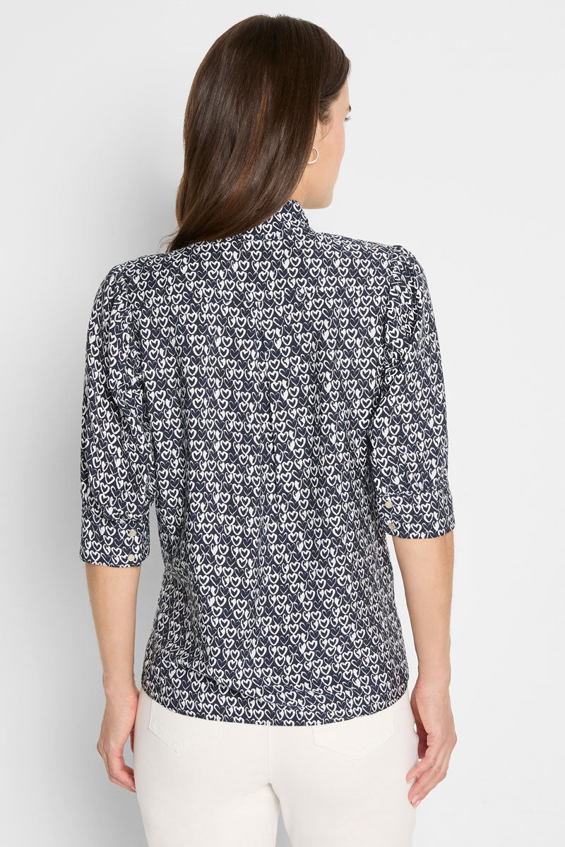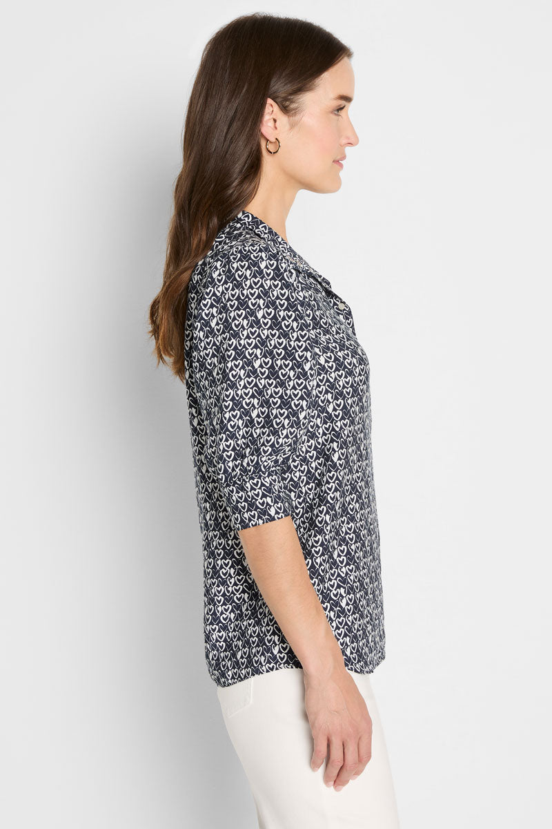 Wear your heart on your sleeve proudly in this cheeky bi-color shirt that flips the script on a classic. Oversized short sleeves and a snap-front placket with brushed metal snaps add a bit of edge to this silky, relaxed fabric. It's pure joy in shirt form.