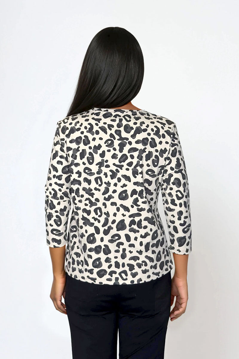 Take a walk on the wild side in this cleverly printed tee, that's season-less and always on-trend.. Sporting a simple v neck and 3/4 sleeve, the fun is in the print! The Animal Print Tee features side slits with a high low hem for a bit of rear coverage. Dress it up or down - it's silky, soft and comfortable.