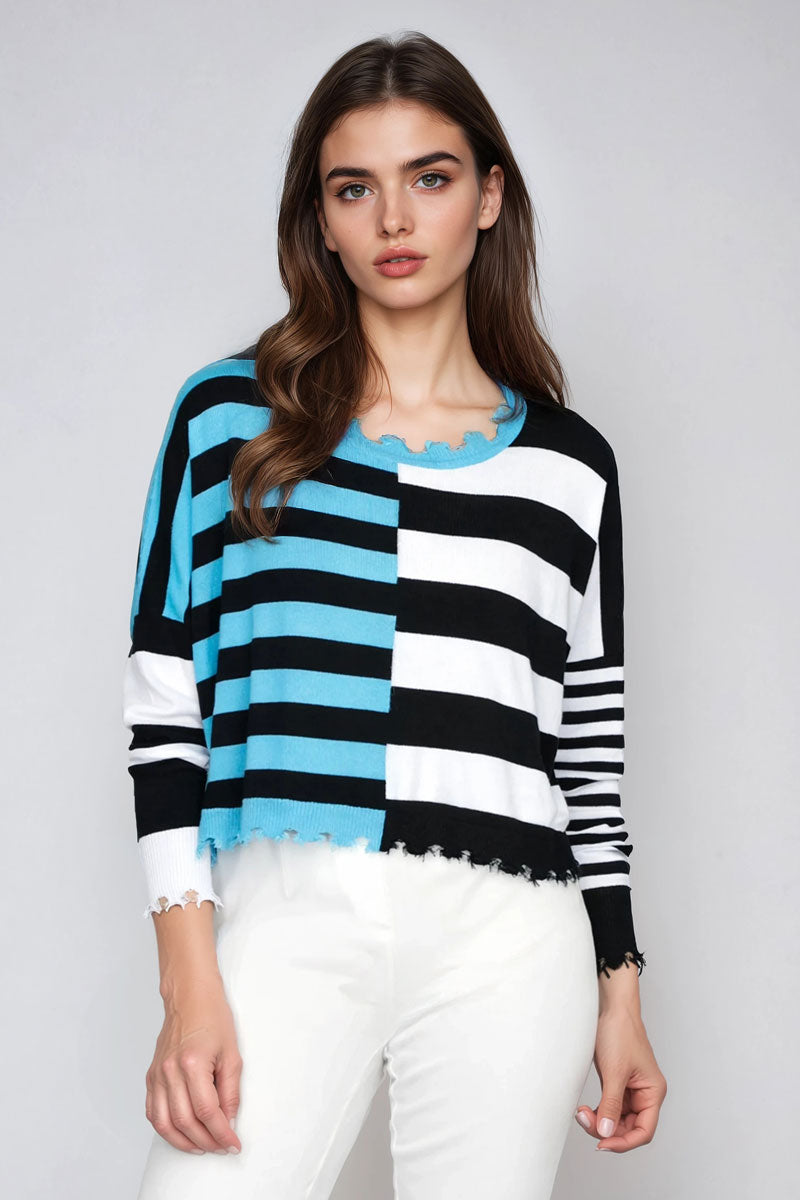 If you haven't been able to wear a Planet Sweater before because it felt too big and too over sized, this one's for you! The Mini Mixed Up Sweater sports its stripes in different sizes and directions with touches of contrast color throughout. Shorter in length with distressed edges at the neck, hem and cuff, it's soft, comfortable and fun and a great pick me up on a dreary day!