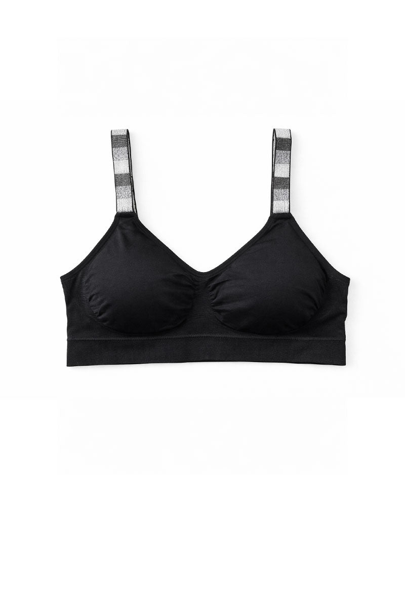 Experience everyday comfort with this seamless bra. Designed with smooth molded cups and soft stretch fabric,the Strap-Its Love Bra provides gentle support and a flattering, natural shape. The wide underband offers a secure fit, while the metallic ombre design straps add a subtle touch of texture. Perfect for all-day wear under your favorite tops.'