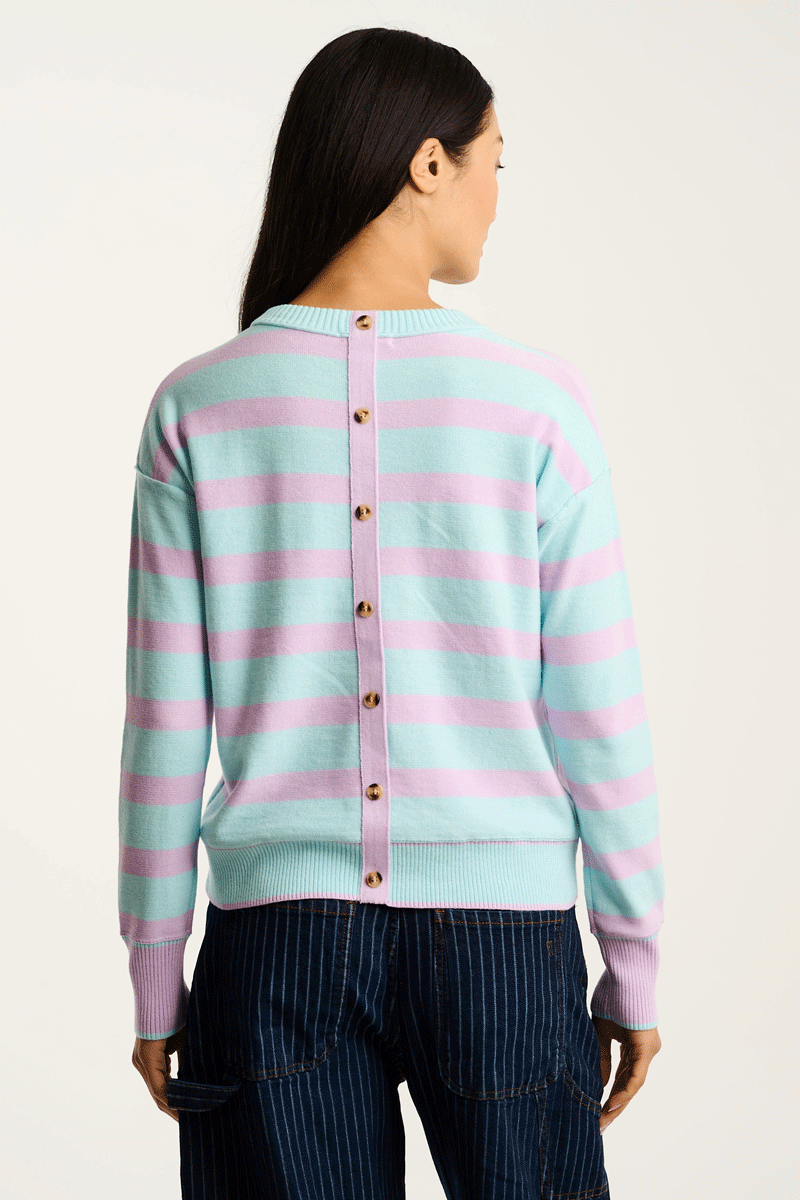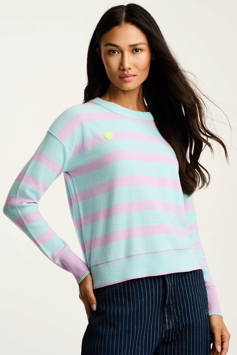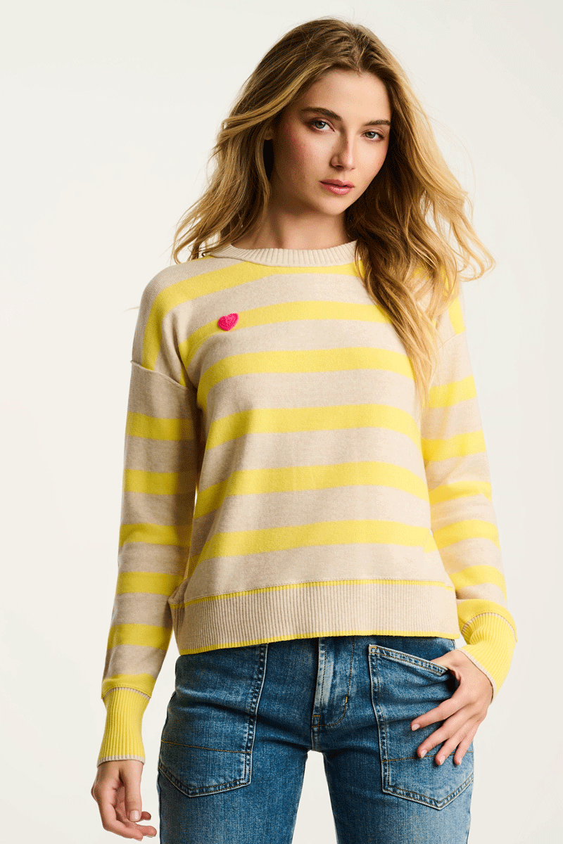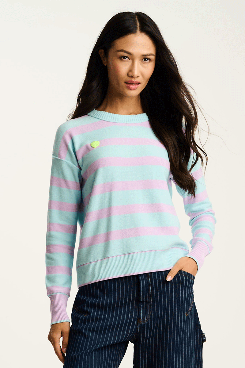 Sport your stripes with a little extra love! This soft cotton knit has a laid back sporty vibe with added edge from the button detail down the back. A single embroidered heart adds a subtle touch of whimsy.