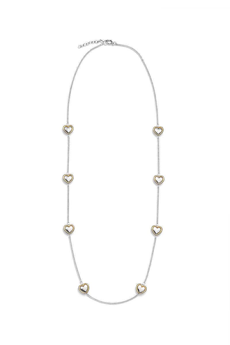 A delicate silver chain necklace accented with evenly spaced two-tone heart charms for a subtle touch of shine. Designed with a graceful drape and adjustable length, this piece is perfect for everyday wear or layering with your favorite necklaces. Simple, sweet, and effortlessly stylish.