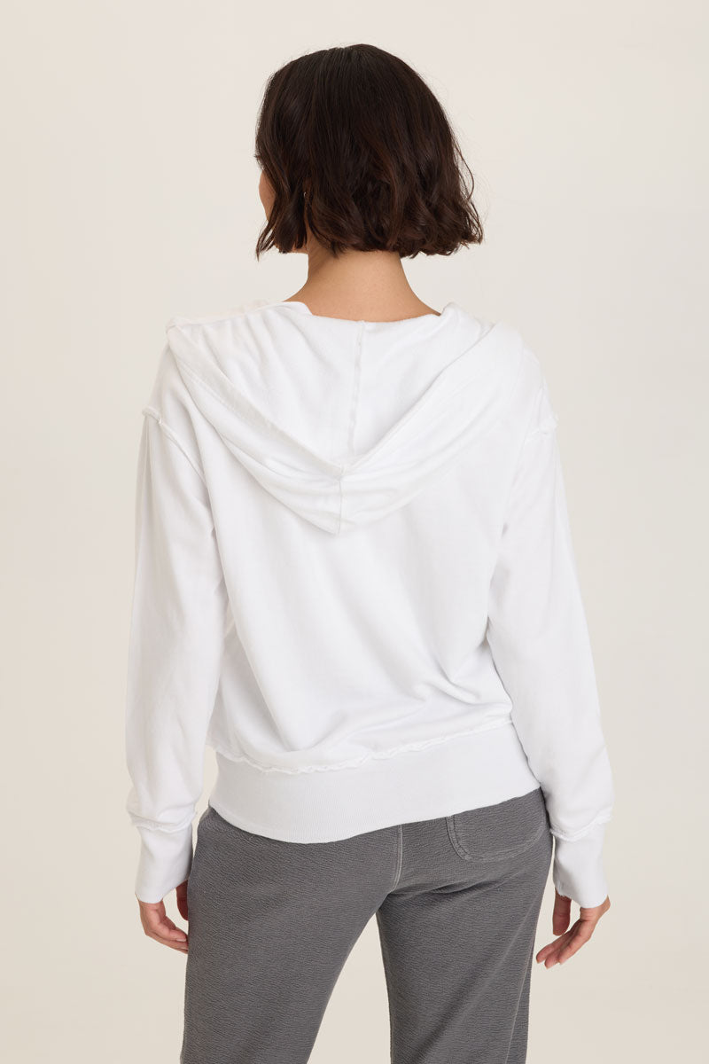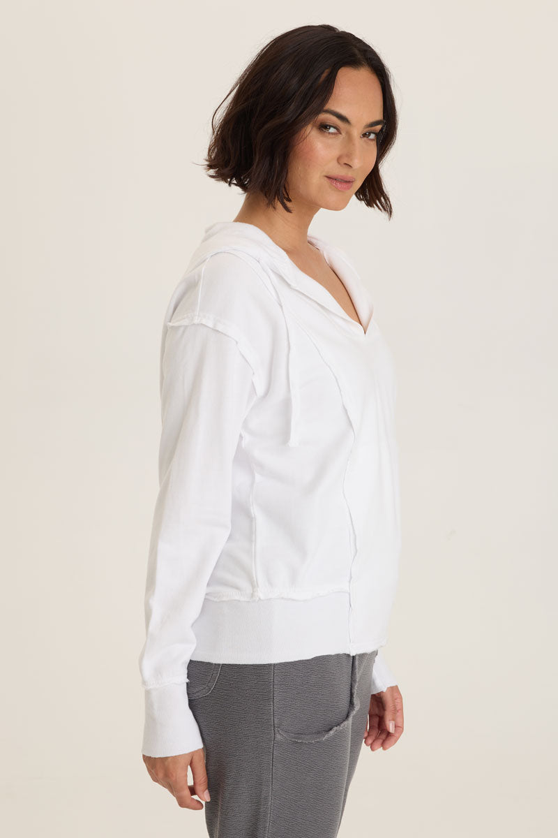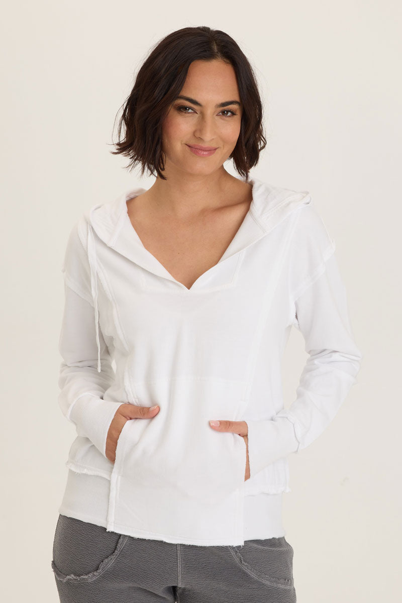Fashionable sweat-shirt dressing is back in the Rosalyn Hoodie.  With a classic kangaroo pocket and asymmetric seaming for a slimming look, the Rosalyn features raw edging detail and exaggerated rib insets at the hem.