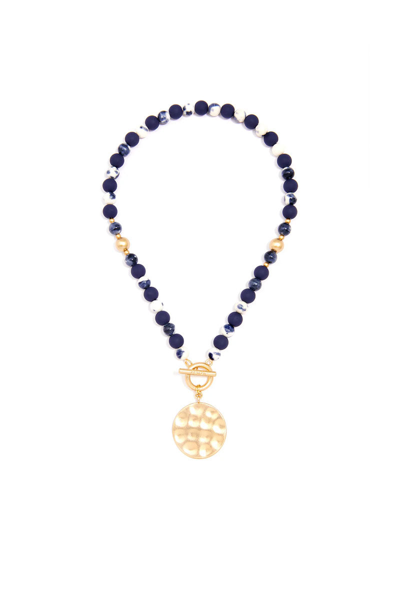 Elevate your everyday look with the Mix Bead Charm Necklace. Designed with a mix of smooth and speckled beads, it is finished with gold-tone accents and a hammered pendant for eye-catching shine.
