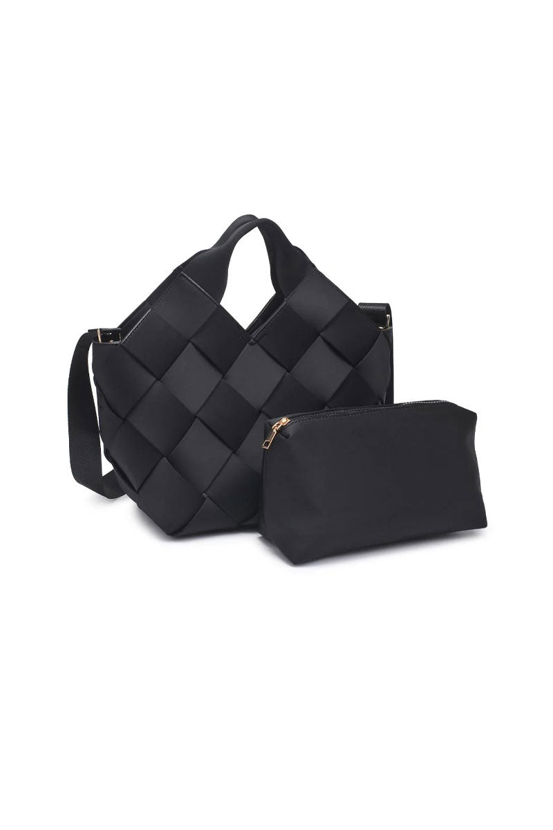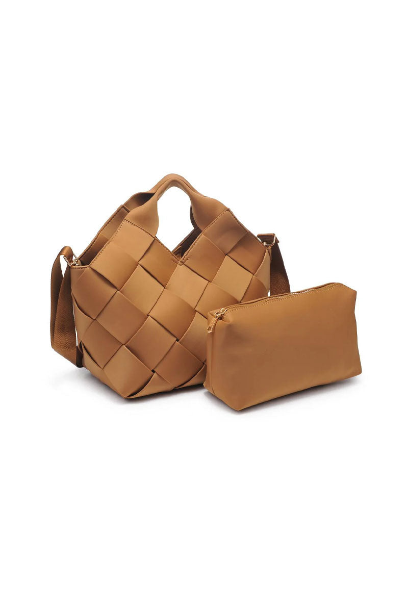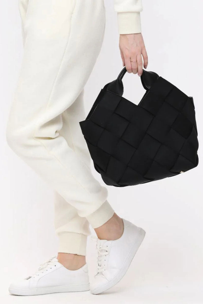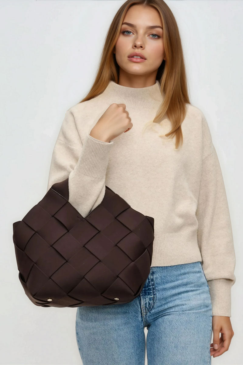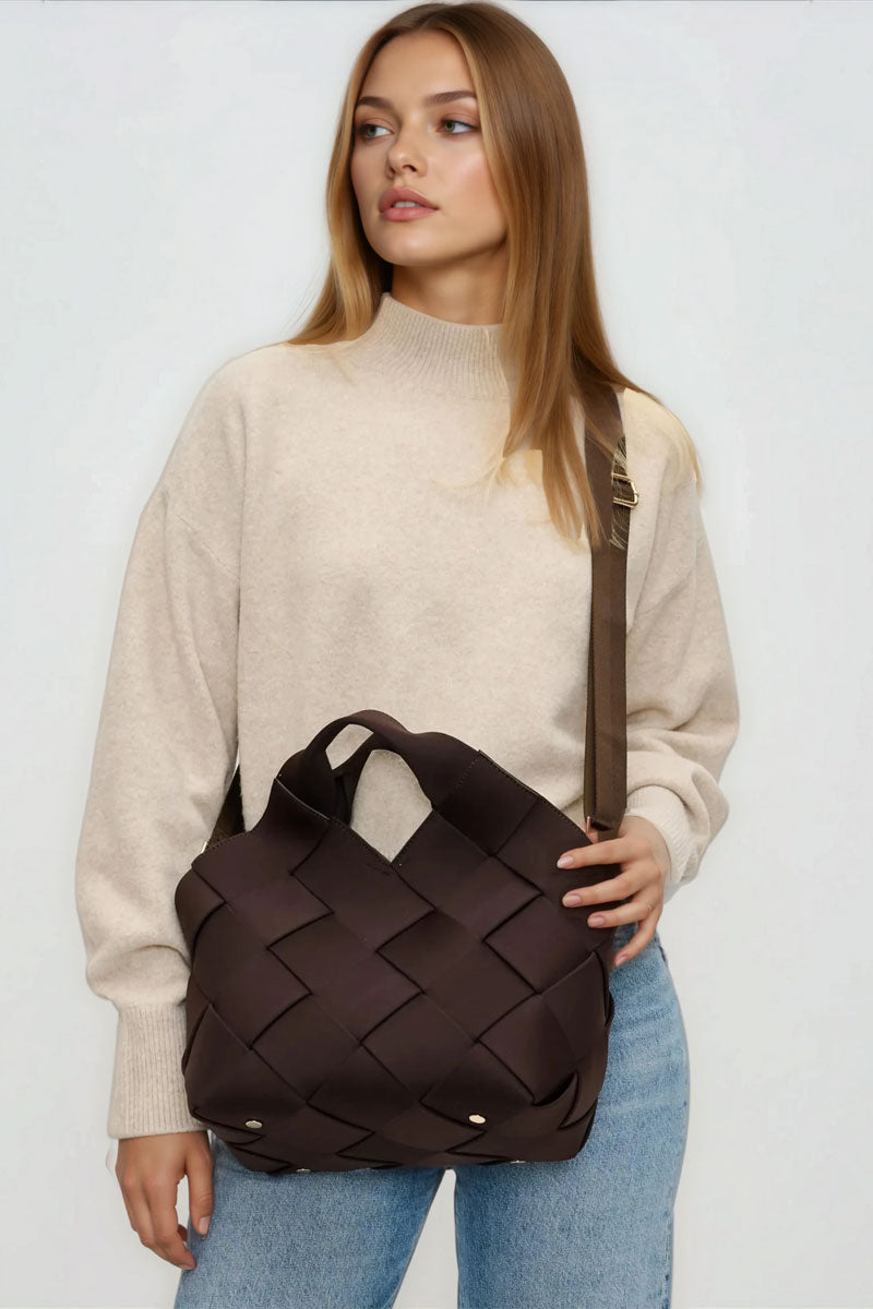 This woven handbag set blends modern texture with everyday function. The main bag features a structured, basket-style design with wide interlaced panels that create a soft yet sculptural look. A comfortable top handle and adjustable crossbody strap offer multiple ways to carry it, while the spacious interior easily holds daily essentials.