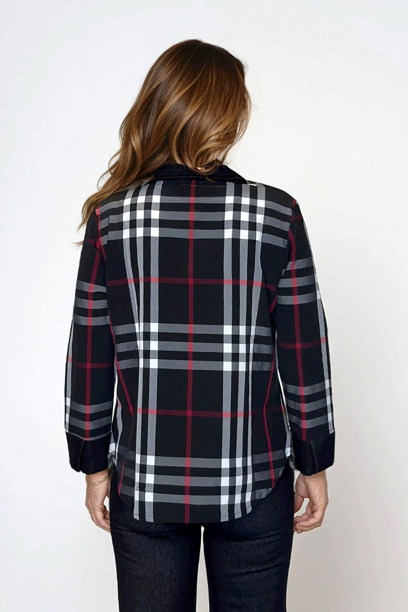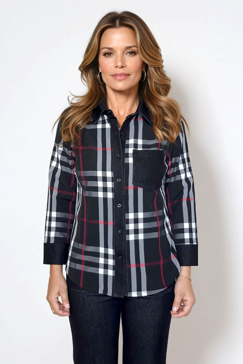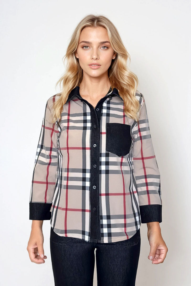 Plaid meets denim in our elevated version of the classic button down. This crisp poly blend blouse in a familiar plaid print features denim touches at the collar, cuff and button placket. Pair with classic black jean or pant for a polished denim look.