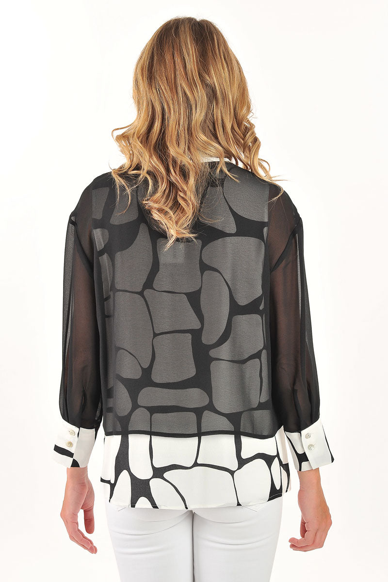 Discover understated luxury in this geometric print blouse, where modern design meets timeless elegance. The sheer chiffon overlay floats gracefully above the captivating print, creating dimensional depth while allowing the pattern to take center stage. Translucent sleeves with a refined two-button cuff detail add a touch of polish, while the relaxed A-line swing cut ensures effortless comfort and flattering movement.