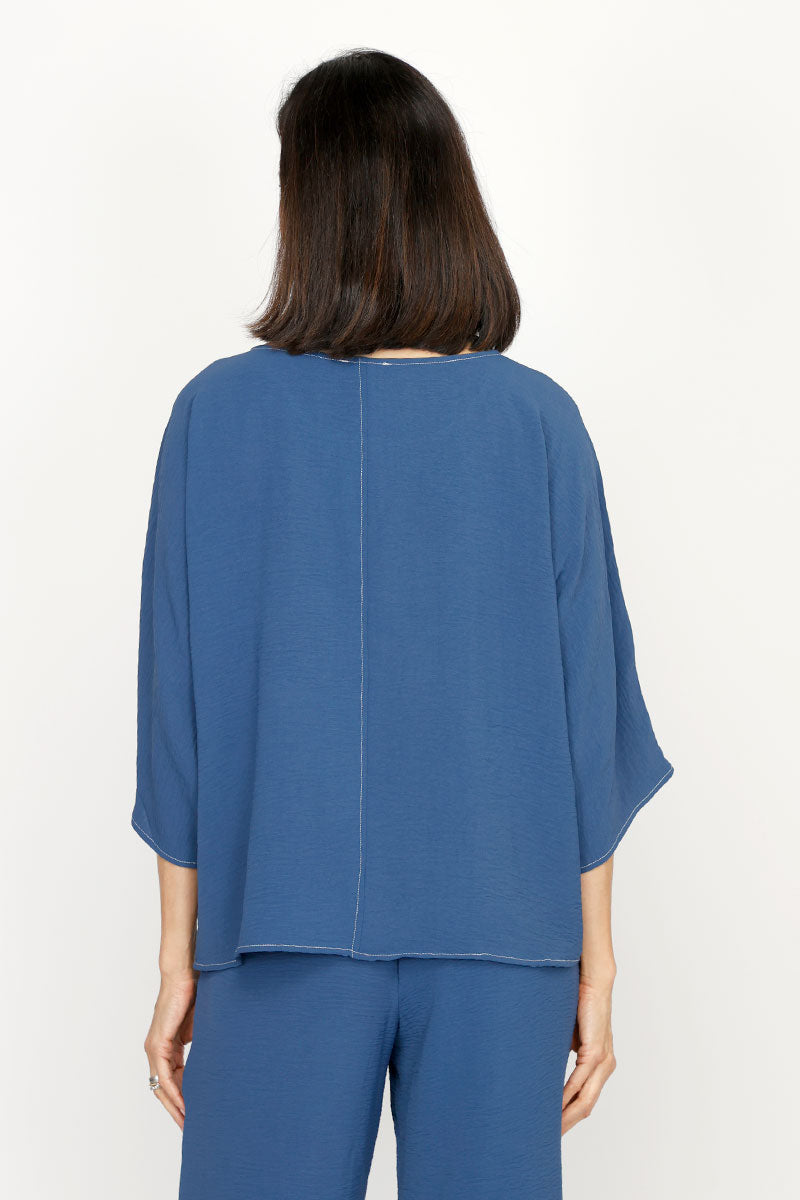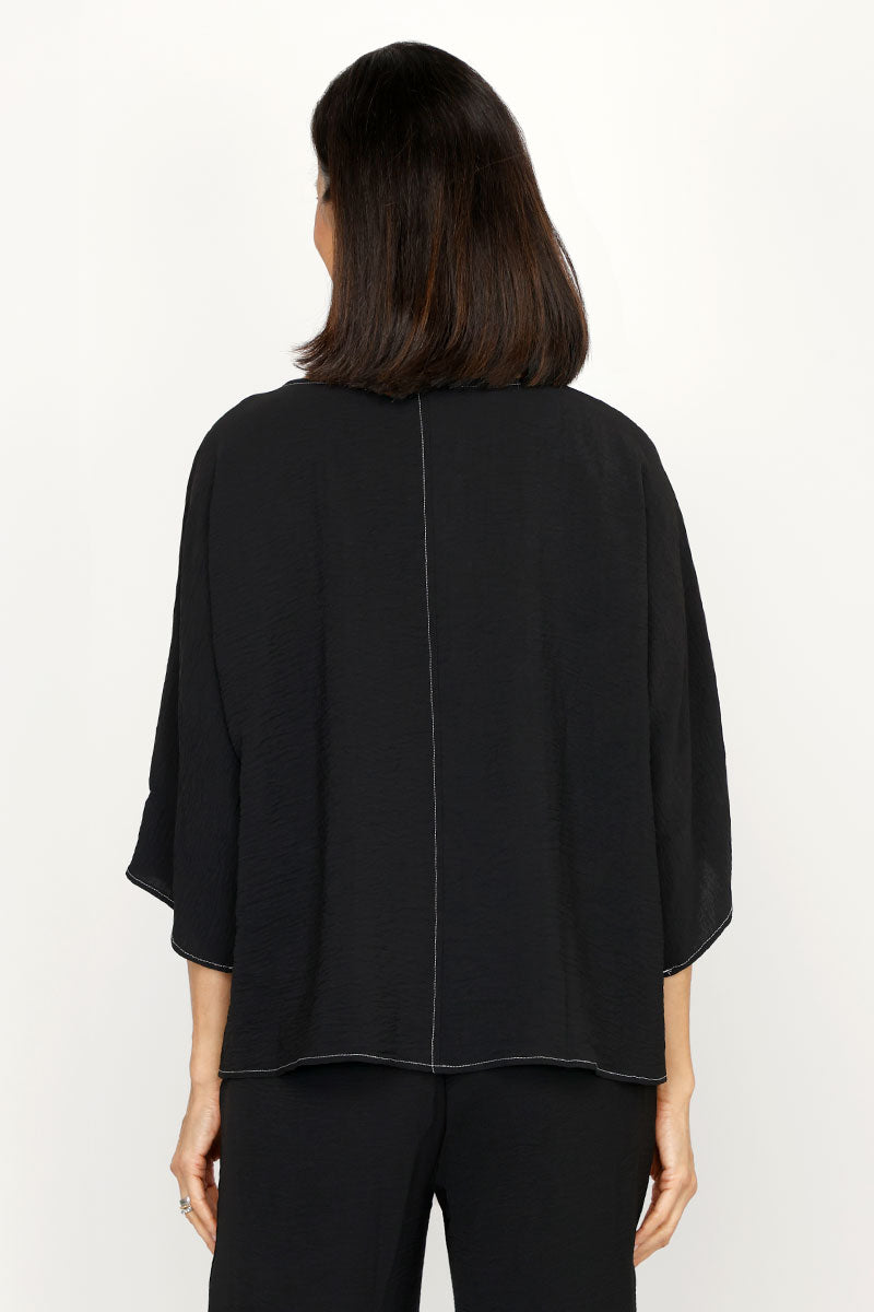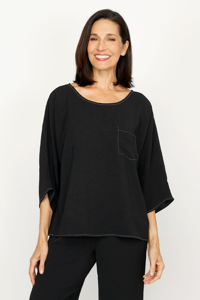 What could be more versatile than a simple short sleeve top in a lightweight gently crinkled fabric? Short dolman sleeves keep the mood low-key with contrast stitch details that add a bit of pop. The easy, boxy shape and relaxed fit are designed for comfort.