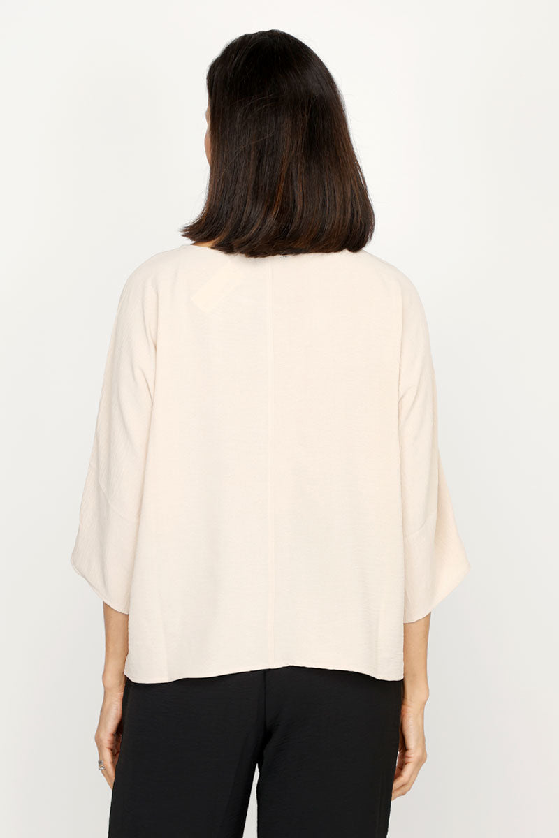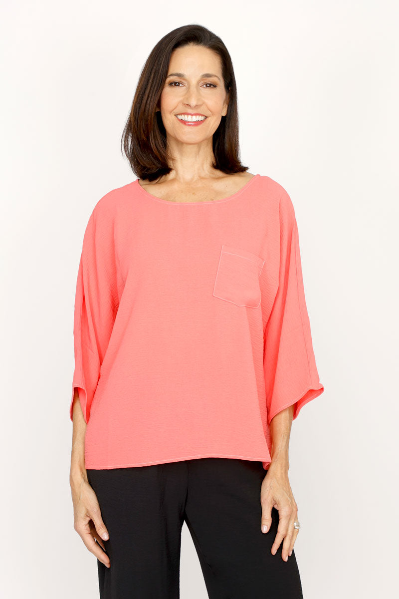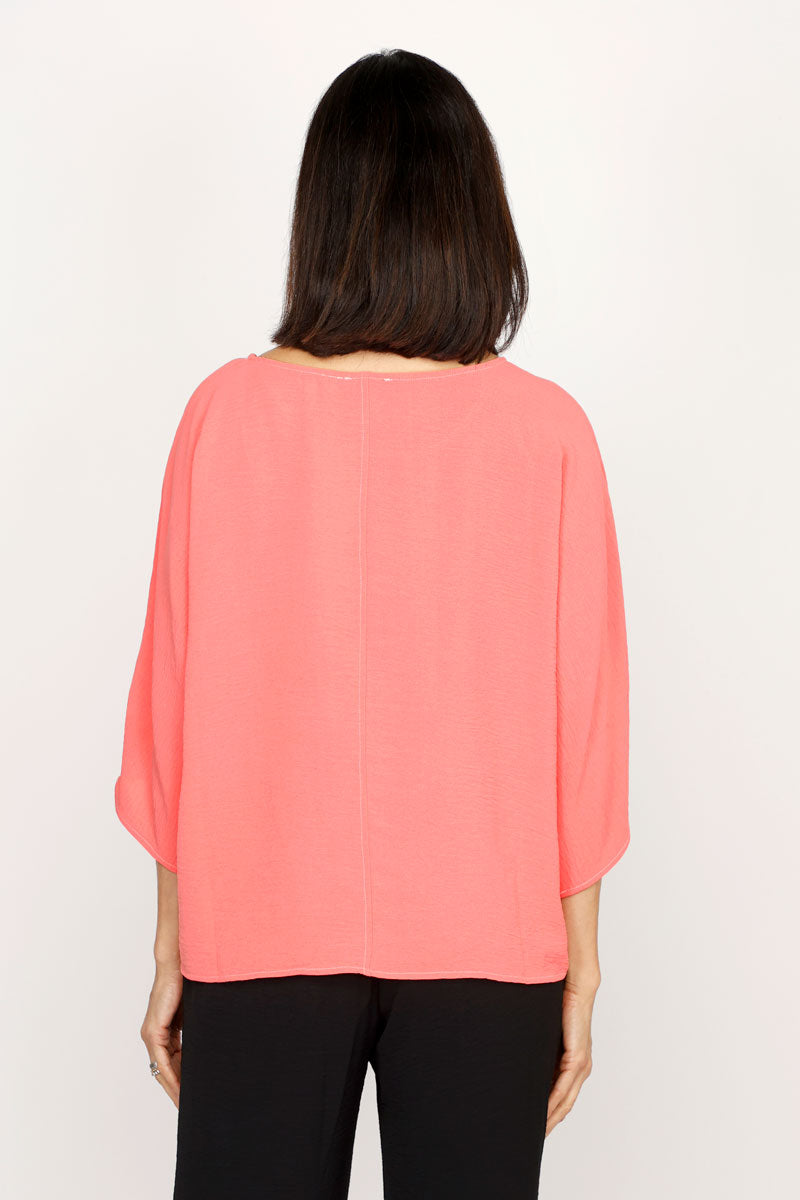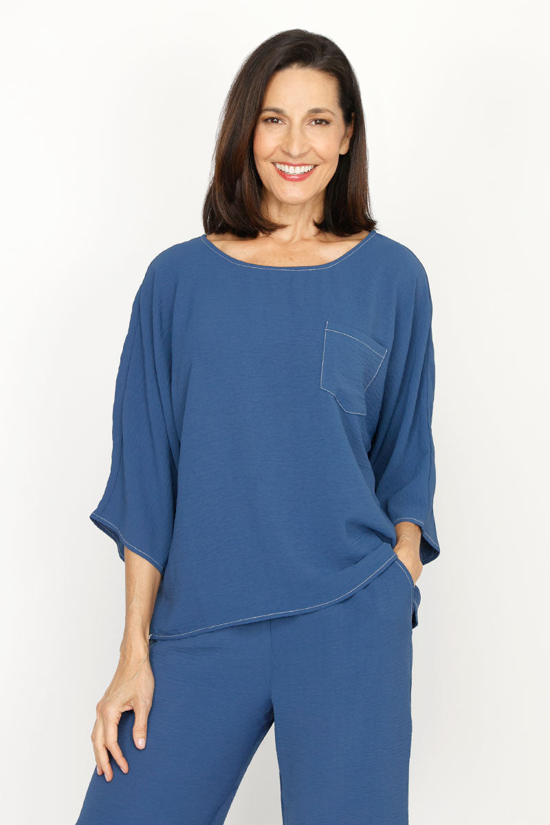 What could be more versatile than a simple short sleeve top in a lightweight gently crinkled fabric? Short dolman sleeves keep the mood low-key with contrast stitch details that add a bit of pop. The easy, boxy shape and relaxed fit are designed for comfort.