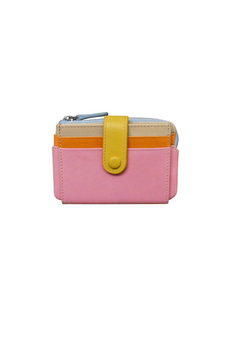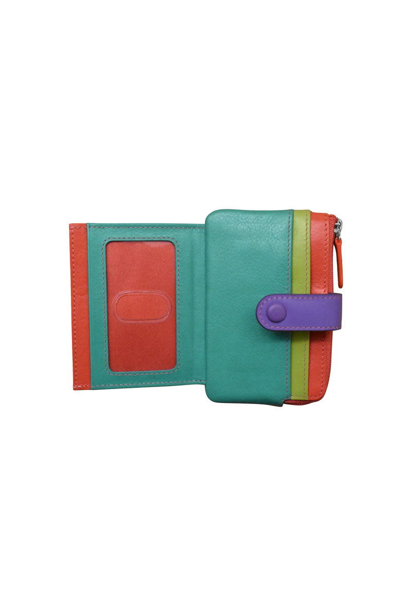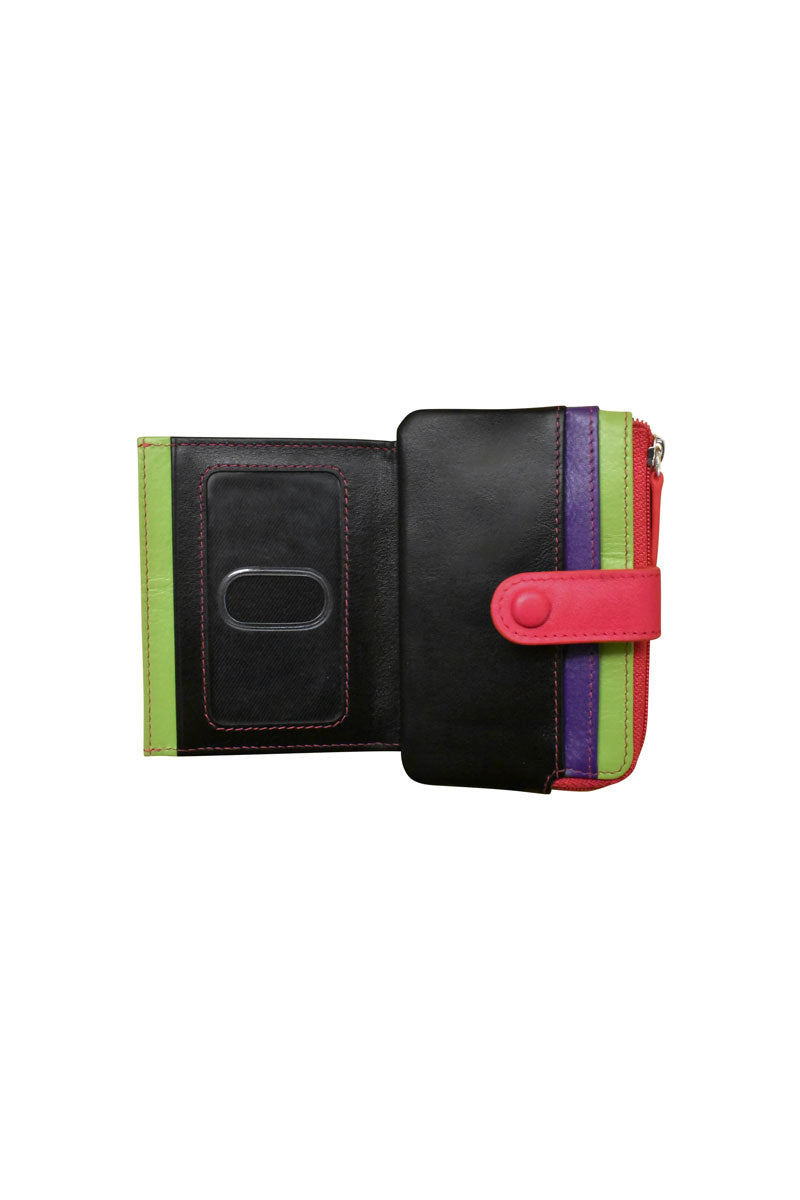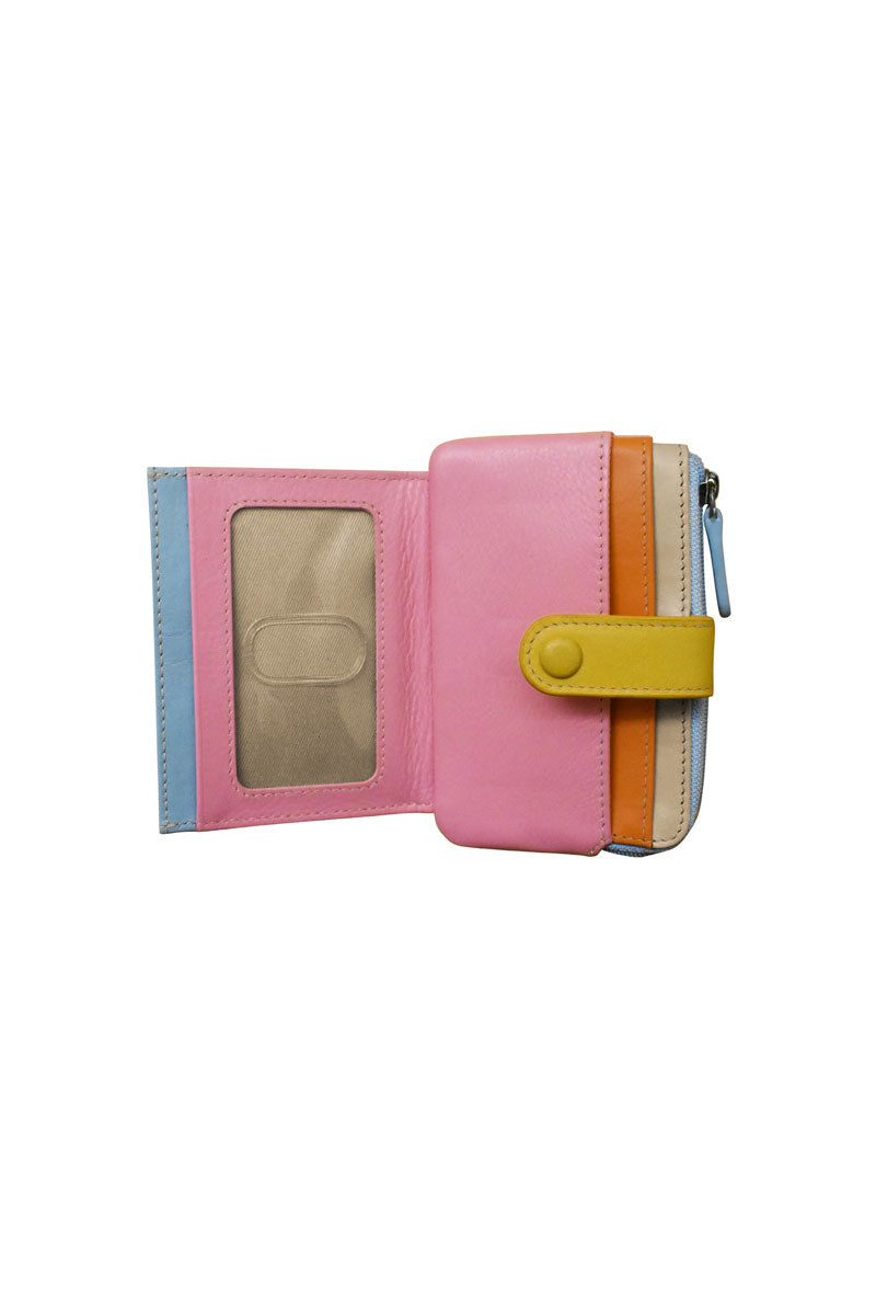 A compact leather wallet designed with smart organization and playful, colorful interior accents, featuring multiple card slots, a secure snap closure, and a zip pocket to keep everyday essentials neatly in place.