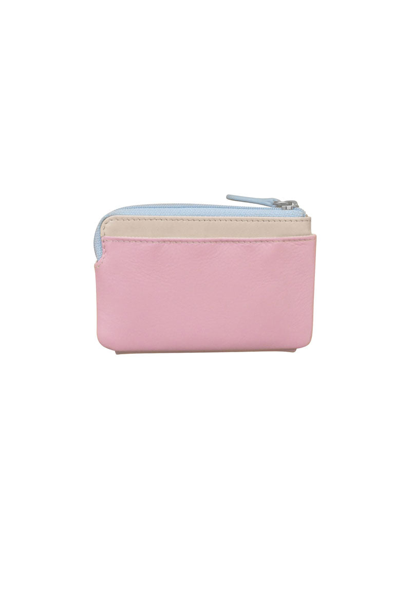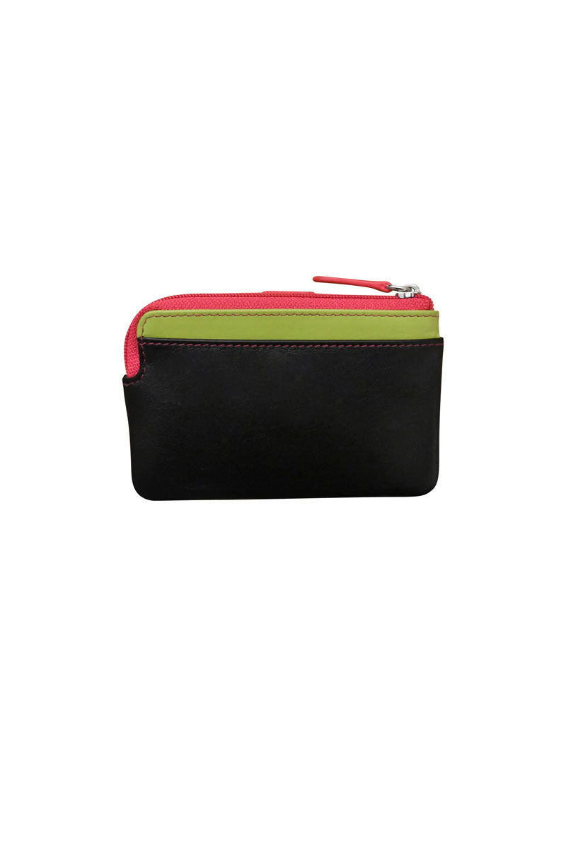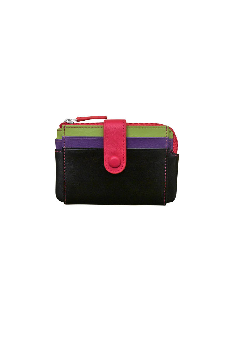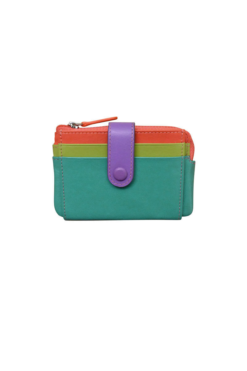 A compact leather wallet designed with smart organization and playful, colorful interior accents, featuring multiple card slots, a secure snap closure, and a zip pocket to keep everyday essentials neatly in place.