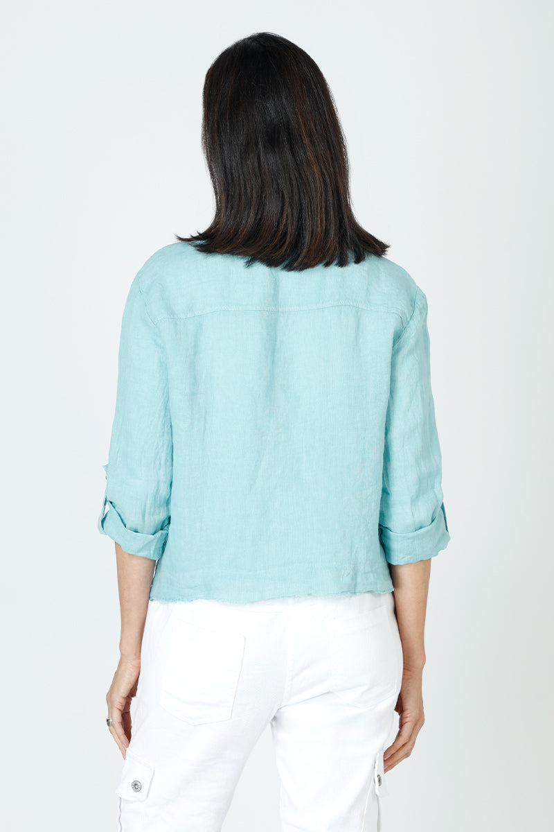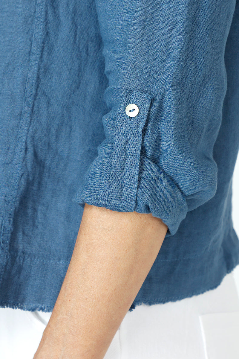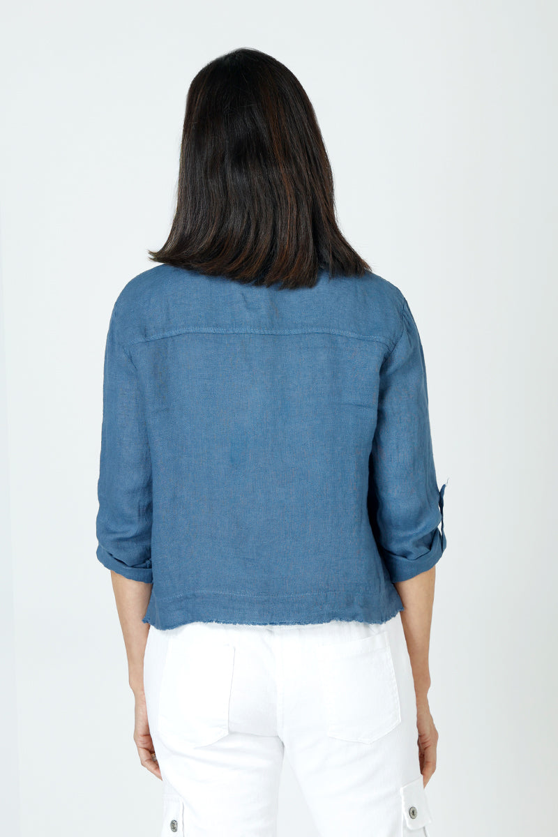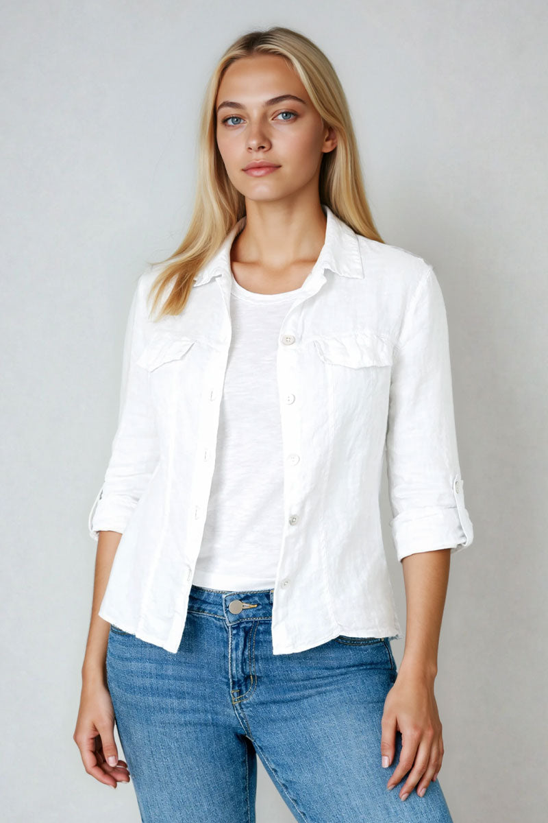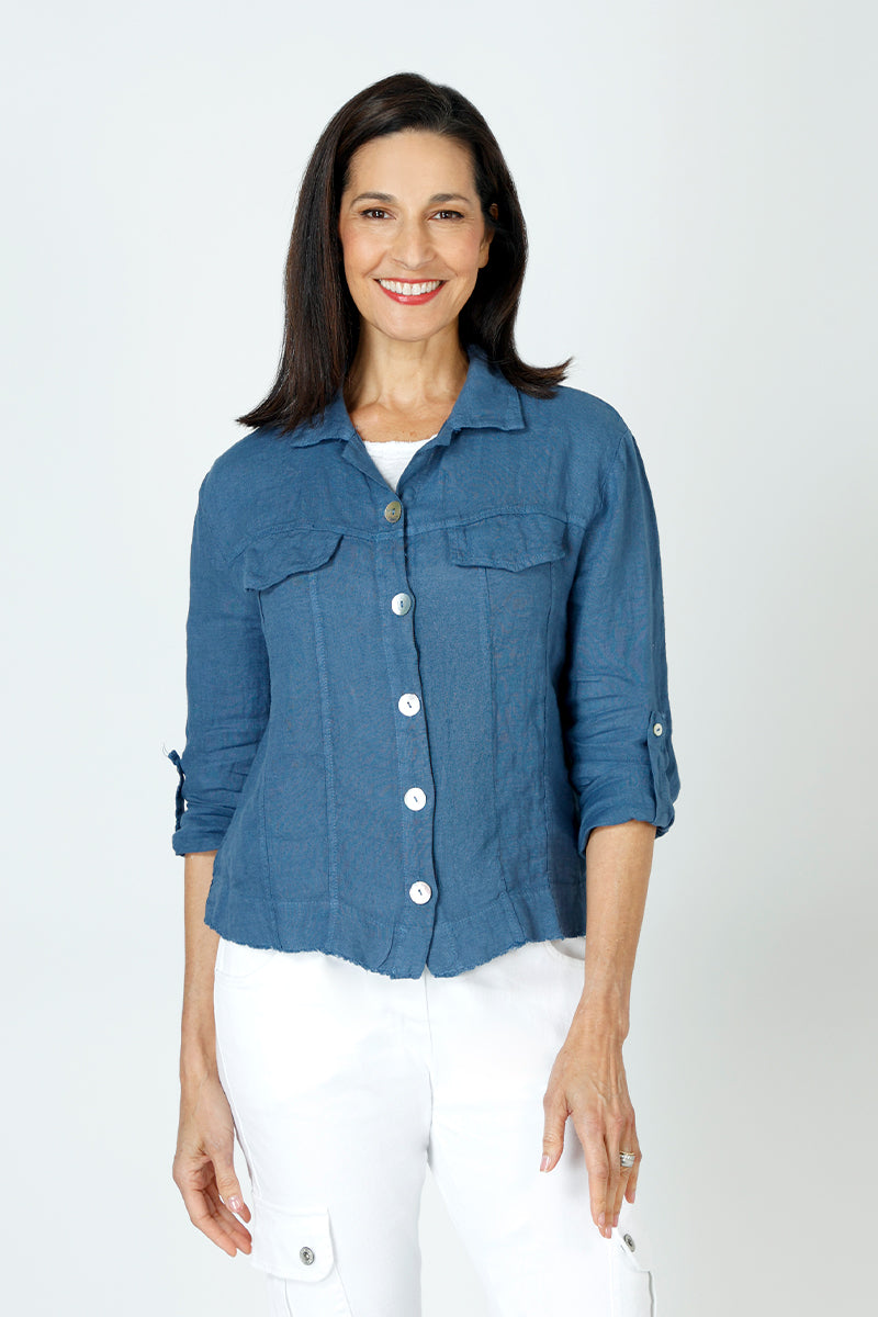 The perfect warm weather shirt/jacket has arrived! Fashioned from mid-weight linen to prevent excessive wrinkling, the 2 Pocket Shacket feels light yet structured enough to hold it's shape. Raw seam details at the curved hem give this jean-jacket-inspired topper a laid-back relaxed feel.