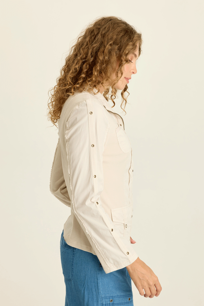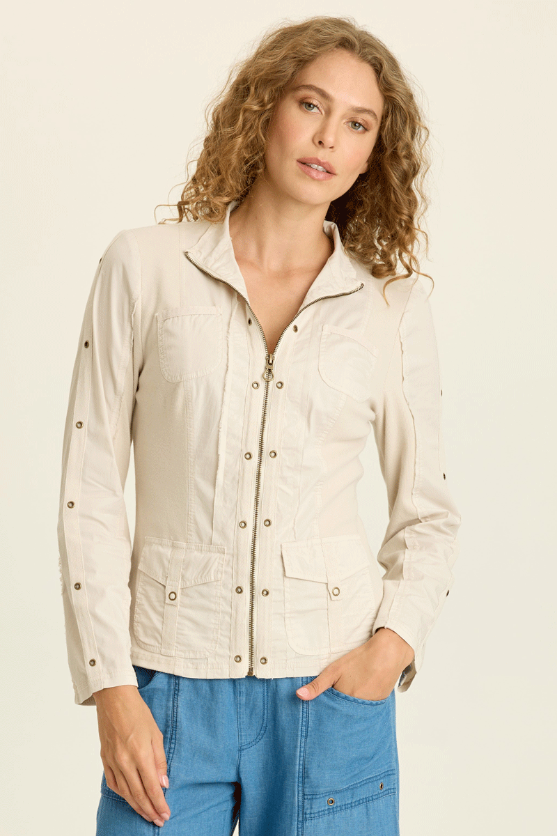 Elevated athleisure is yours with the Murphy Jacket! This fitted zip-up mock neck jacket features brass eyelets along the zipper closure and sleeve, plus brass snaps at the front pockets. Rib inserts round out this flexible and light weight jacket.
