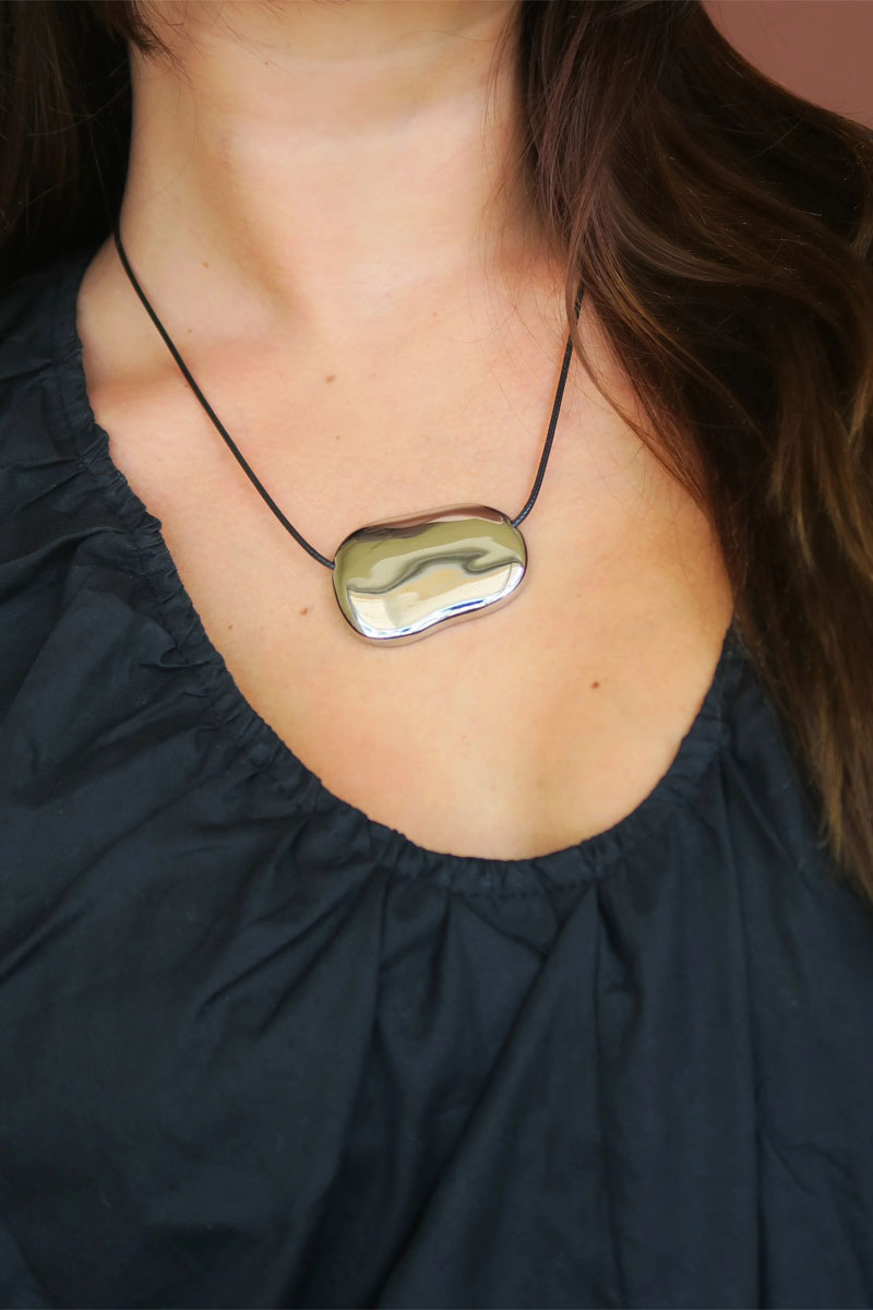 A sleek, sculptural pendant that brings modern minimalism to any outfit. Its fluid, pebble-like shape catches the light beautifully, giving your neckline an effortless, contemporary edge. Perfect for adding a chic, artistic touch to everything from tees to evening looks.