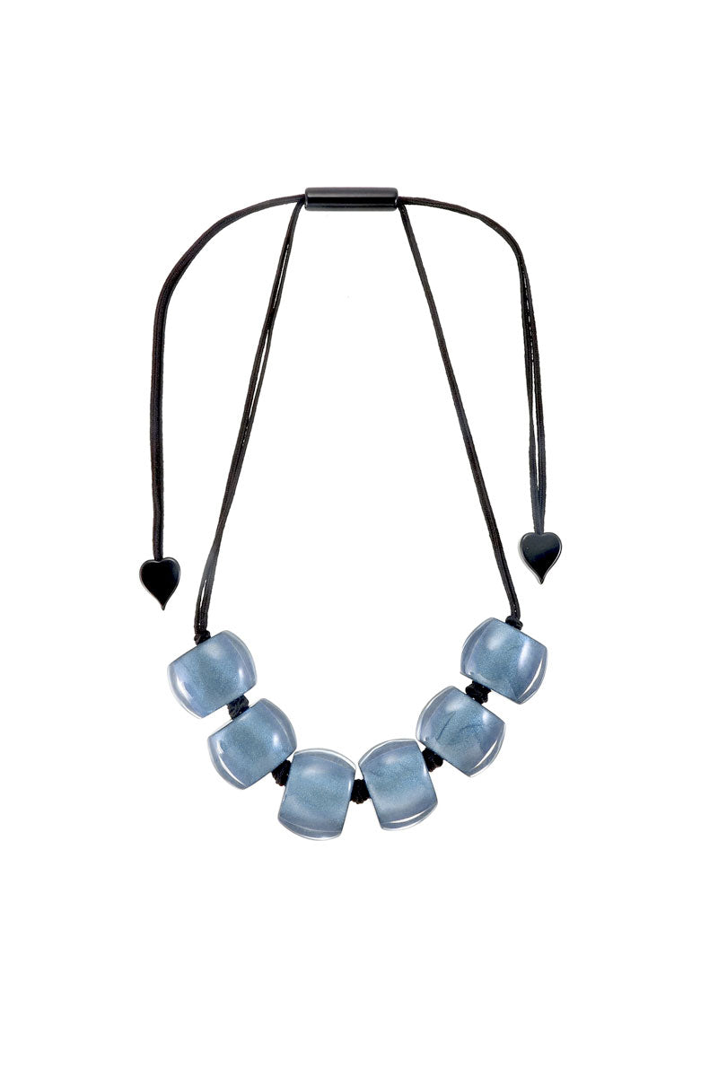 A striking blend of modern design and effortless wear, this necklace features a row of sculptural resin beads with a luminous, glass-like finish. The adjustable cord allows for customizable length, while subtle heart accents at the ends add a refined, playful detail. Lightweight and eye-catching, it is the perfect statement piece to complete any look.