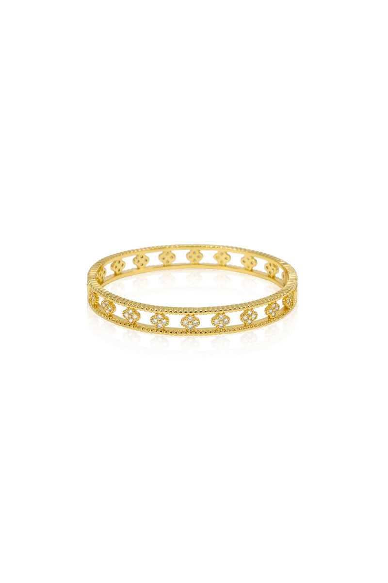 Delicate and radiant, this bangle features an intricate clover-inspired design adorned with sparkling stones. The open silhouette keeps it lightweight, while the beaded border adds a soft, feminine charm. A timeless piece that transitions effortlessly from casual elegance to evening glamour.