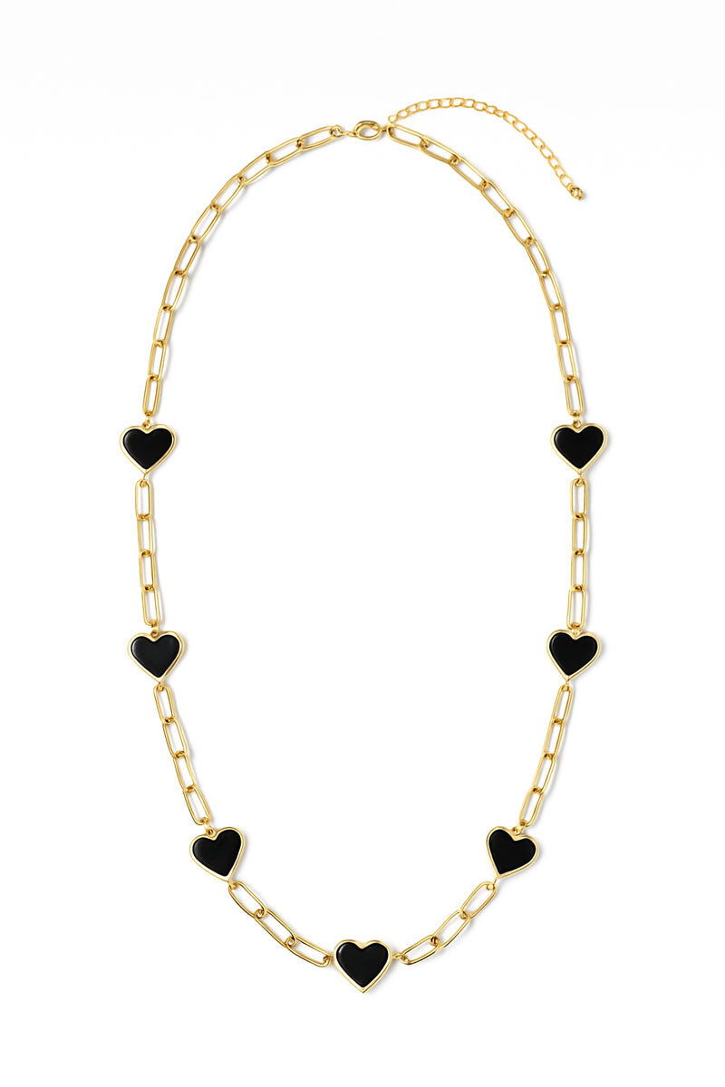 A chic paperclip chain necklace detailed with glossy heart charms for a look that feels both modern and romantic. The mix of sleek links and playful hearts creates a bold yet refined statement that styles beautifully with everything from casual layers to dressier looks. Perfect for adding a touch of personality and polish to any outfit.