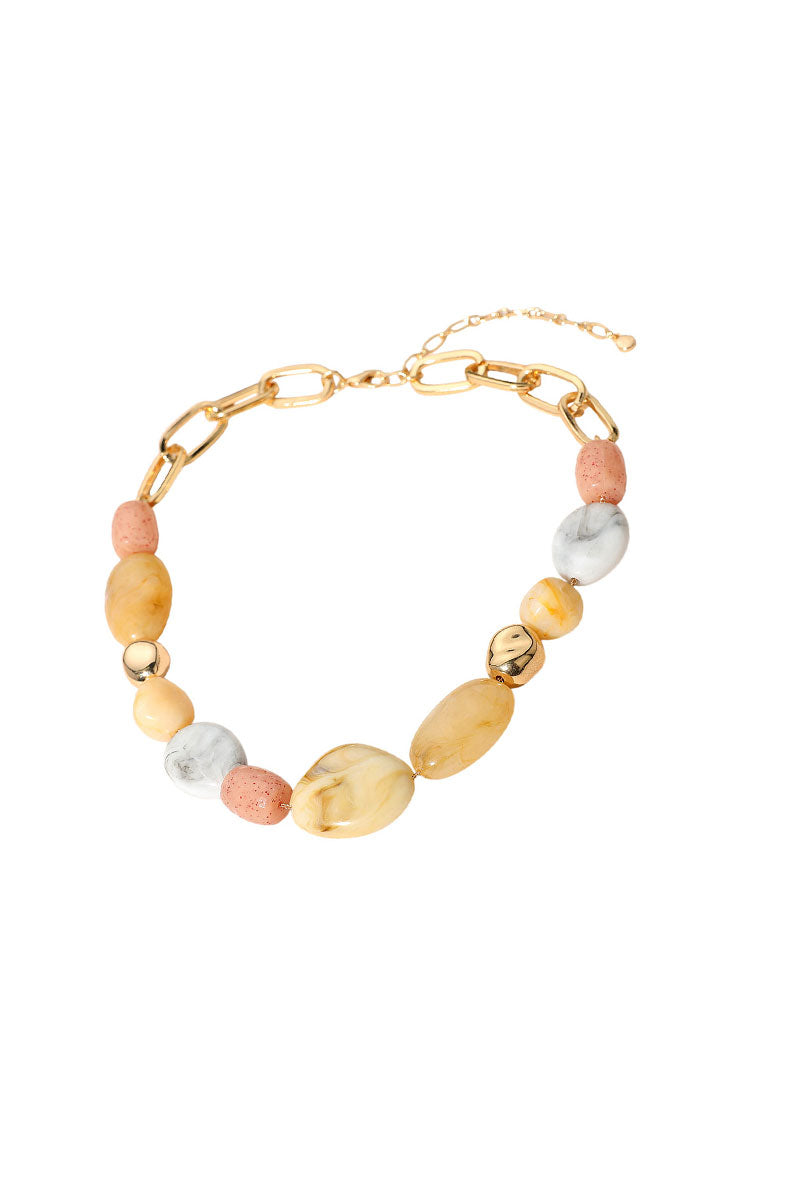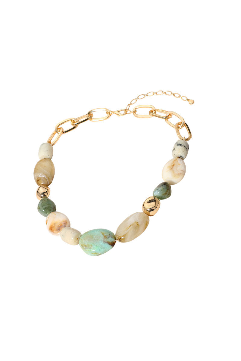 This statement necklace balances bold texture with a touch of modern polish. Featuring smooth marbled stones and metallic accents linked by a sculptural chain, it adds artful sophistication to any outfit. Lightweight and adjustable, it’s the perfect finishing touch for both everyday looks and dressed-up occasions.