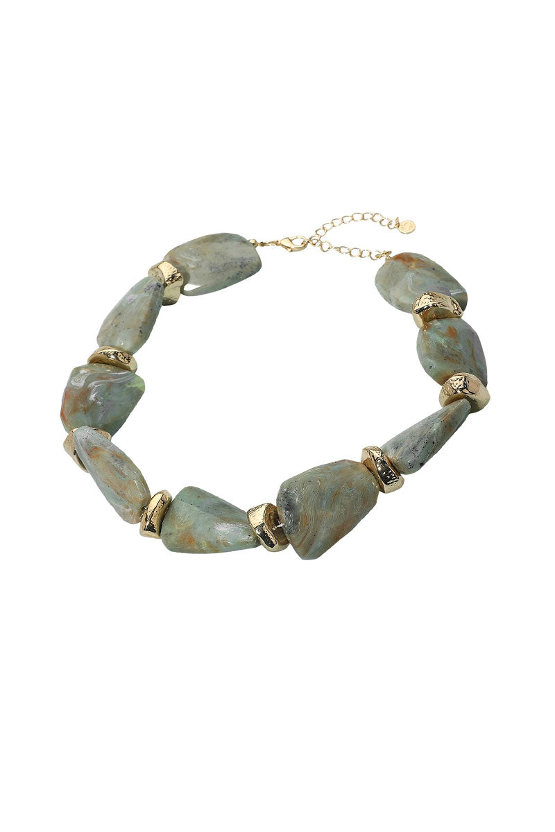 Bold and organic, this marbled stone necklace features chunky, sculpted beads accented with textured gold-tone spacers. Each piece showcases unique swirls of color, creating a naturally sophisticated look. Perfect for adding earthy elegance to both daytime and evening outfits.