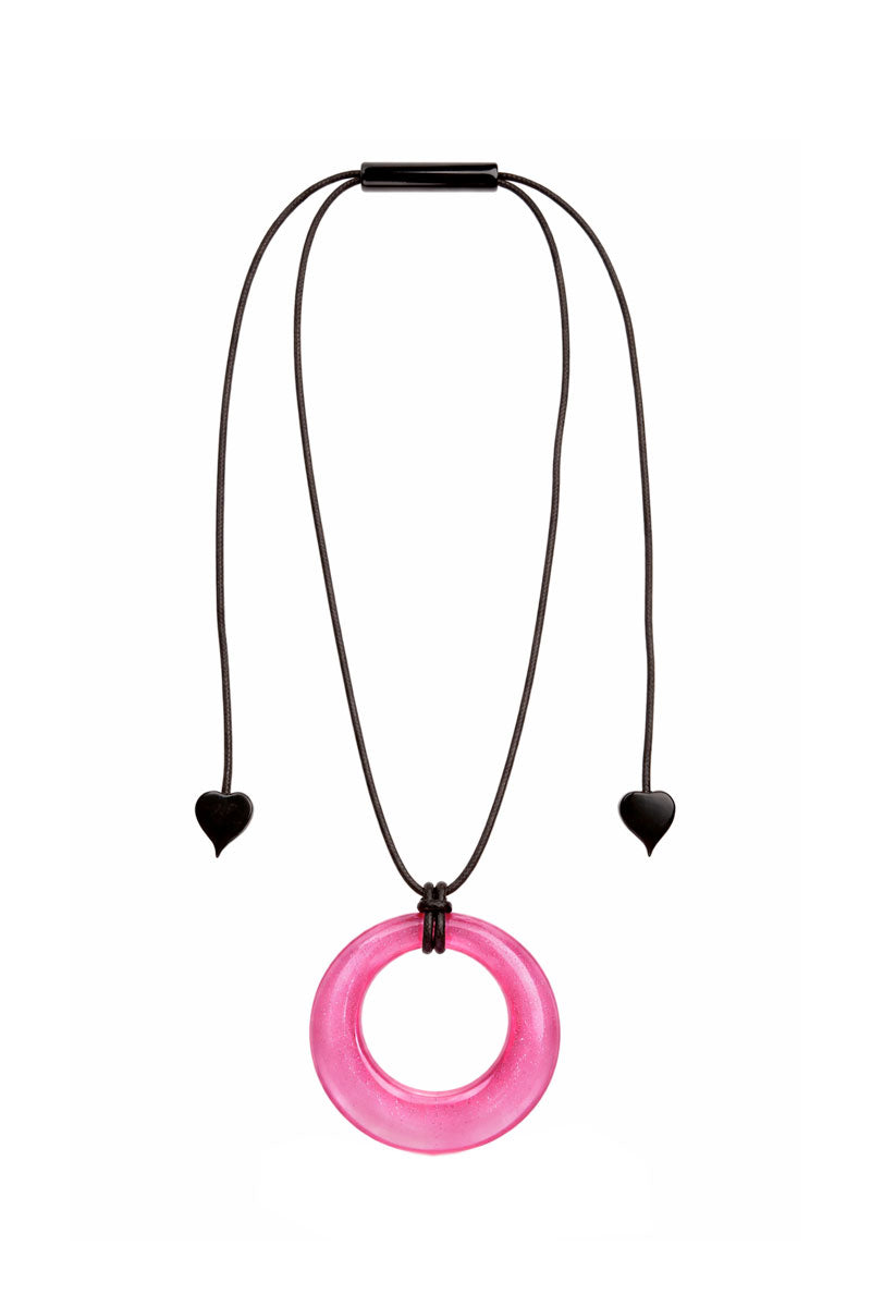A modern statement with a playful edge, this necklace features a bold open-circle pendant with a smooth, glossy finish. Suspended from a sleek adjustable cord with delicate heart accents, it offers both style and versatility. Lightweight yet eye-catching, it is the perfect finishing touch to elevate everyday looks.