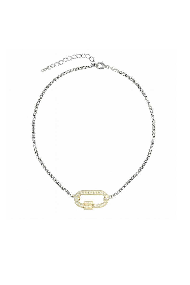 This modern carabiner pendant necklace blends edge and elegance in one sleek design. The dual-tone finish highlights a center link detailed with sparkling accents, adding a subtle hint of shine. Perfect for layering or wearing solo, it’s a contemporary piece that brings polish to any outfit.