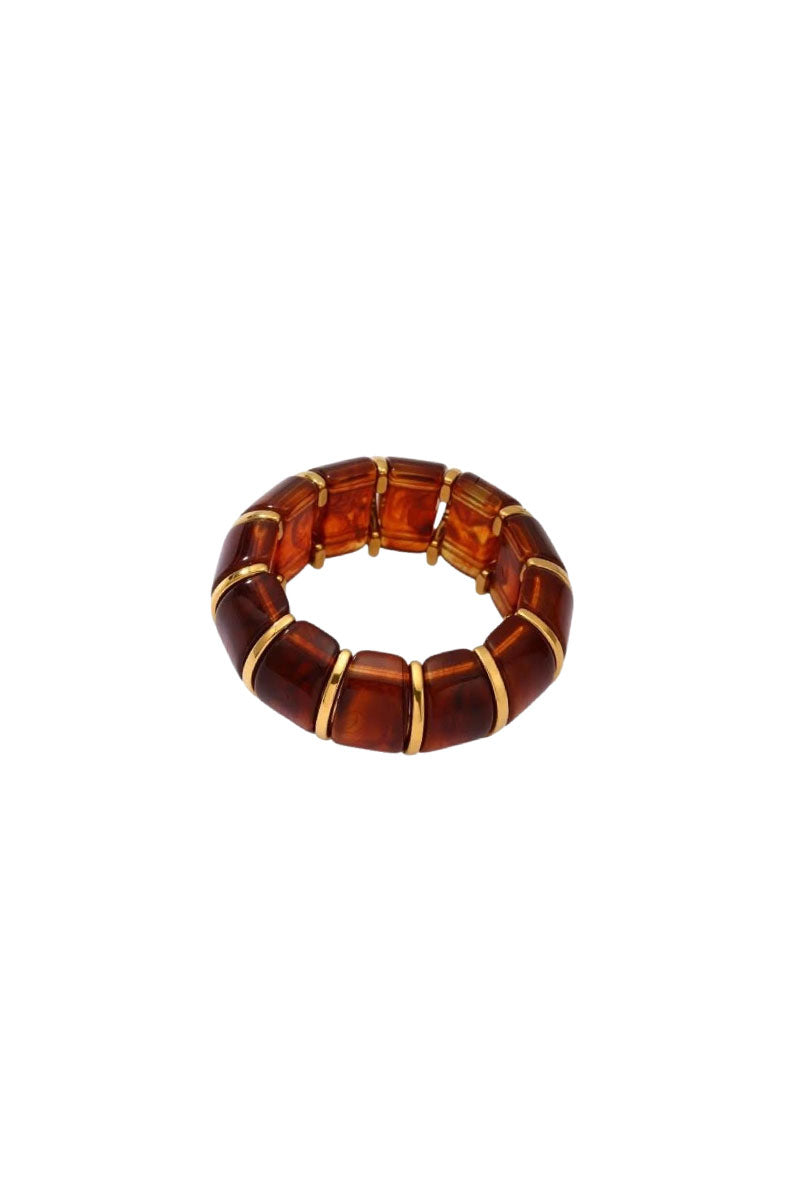 Modern yet timeless, this stretch bracelet combines sculptural design with a warm, glossy finish. Each curved link is accented with sleek metallic details, creating a bold, artful statement. Comfortable and easy to wear, it adds instant sophistication to any look—perfect solo or stacked for extra impact.