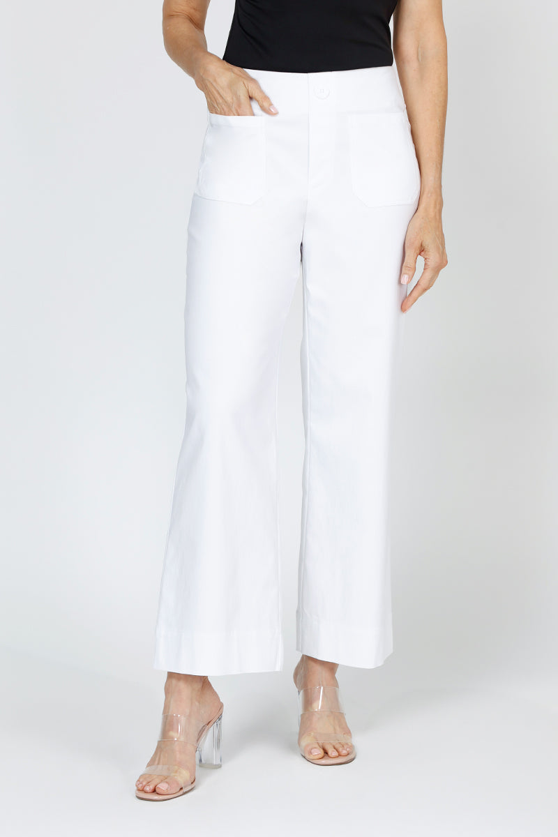 Our favorite pant has gone luxe!  Fashioned from sleek,durable ponte, the Lizzie pant embraces the wide-leg trend in a pant that fits and flatters as only a Holland Ave pant can.  The Lizzie has the look of a trouser, but don't let the button detail and faux zipper fool you -- it's a pull-on pant!  Perfectly placed pockets add a nautical, tailored vibe.  And the leg?  Not too wide, and not too slim, it sports just enough width to stay on-trend in style and comfort. Thick enough to prevent show through,  it holds its shape through the hip and rear without bagging or sagging.