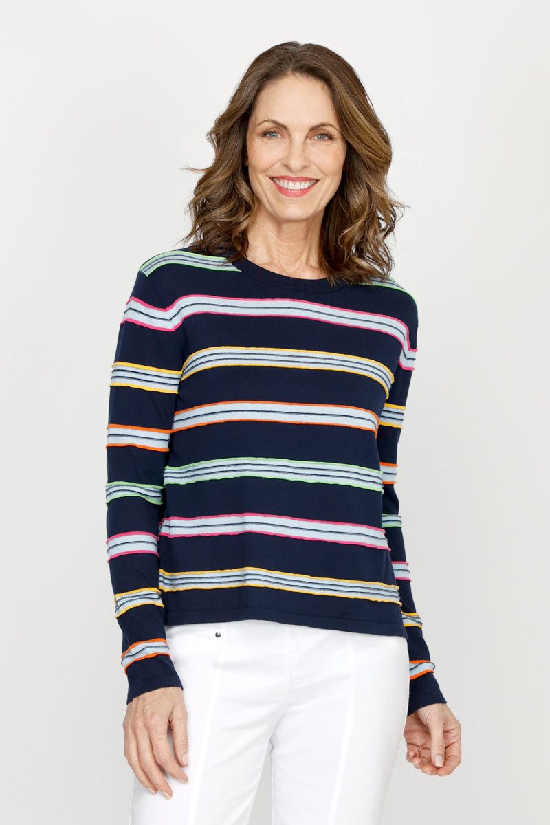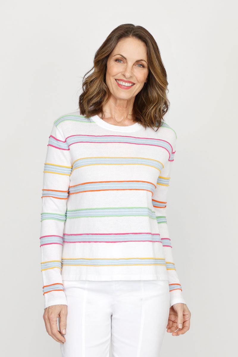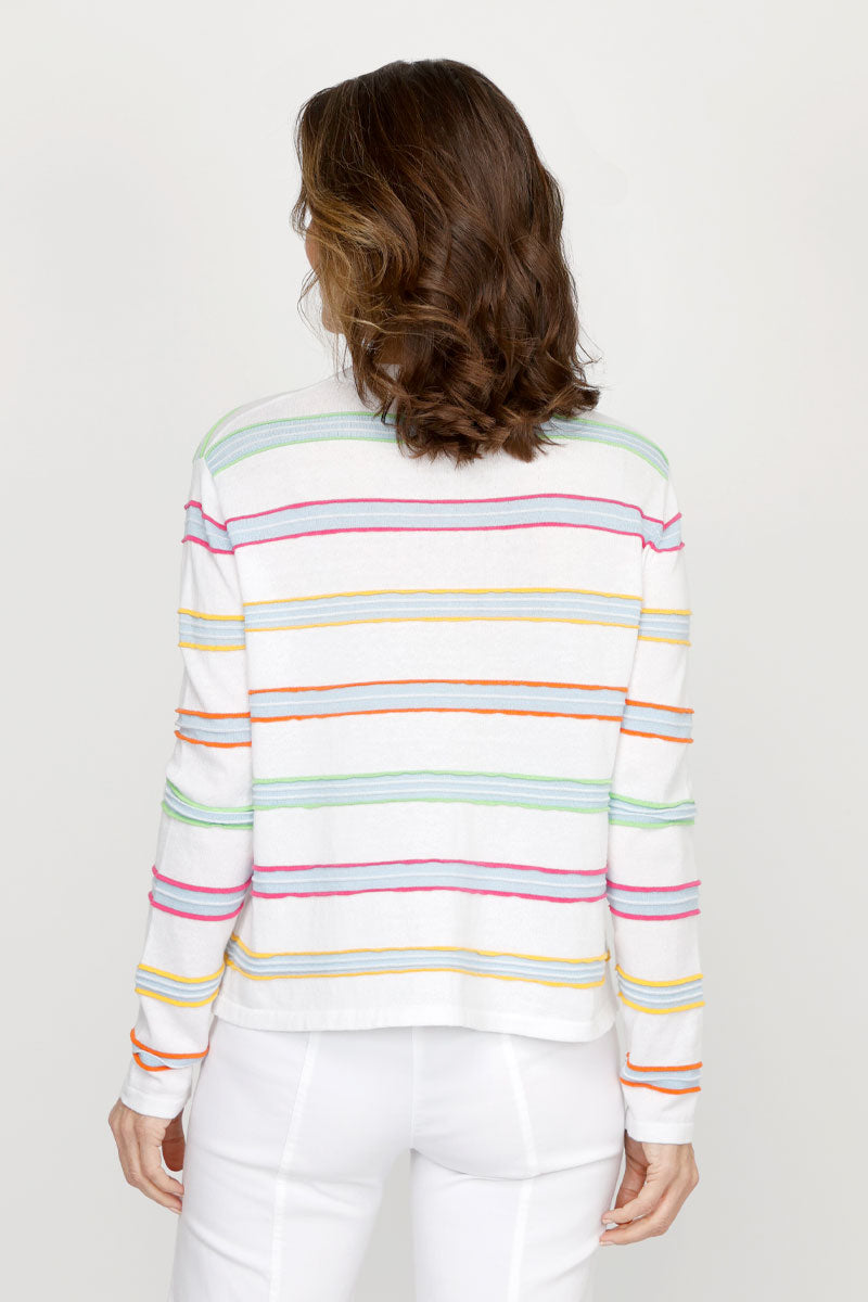 A seasonless lightweight cotton sweater is a must-have for every wardrobe. The Fruit Stripe Sweater fills the bill in premium cotton with tonal textural stripes, each edged in a color of the rainbow. This relaxed knit is super-versatile, soft and comfortable and pairs well with any pant.