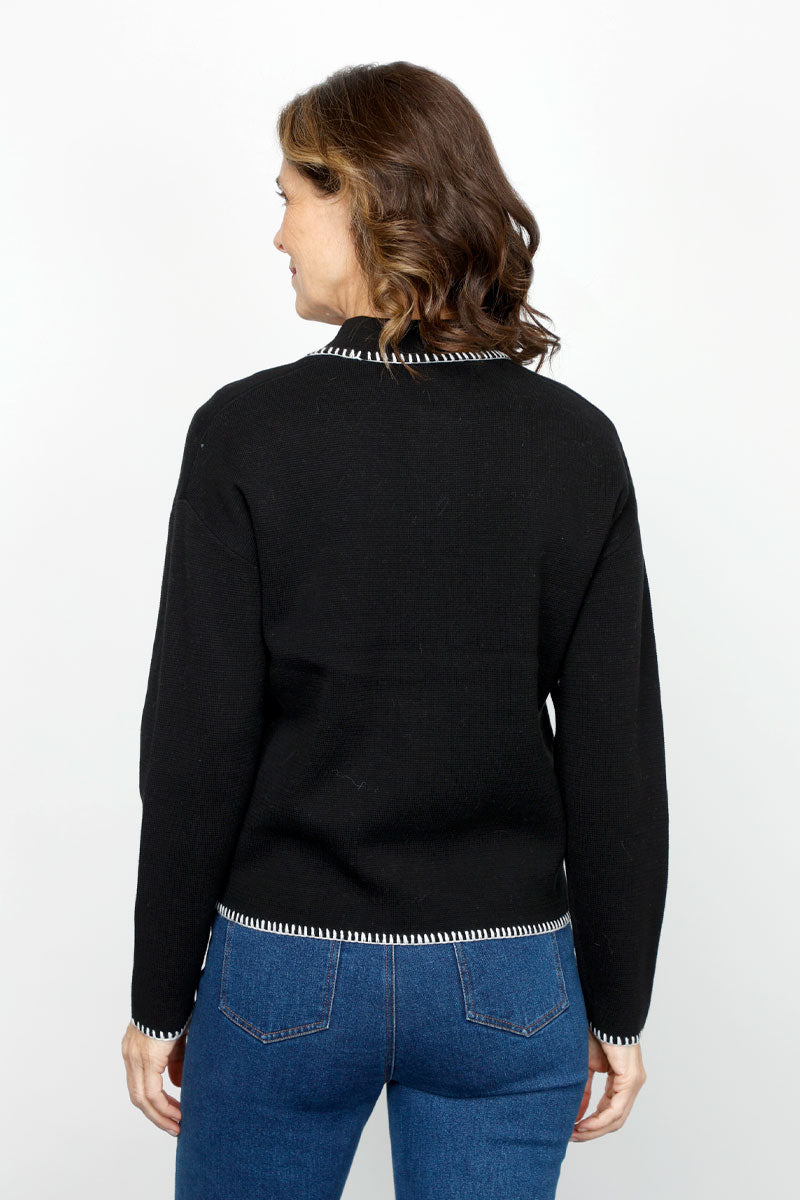 This midweight cotton knit from Metric sits somewhere between casual and refined. The 2 Tone Contrast Stitch Cardigan features a zip front and long sleeves. Ivory blanket stitching around the collar and hem adds a hand made touch to this relaxed and comfortable topper.