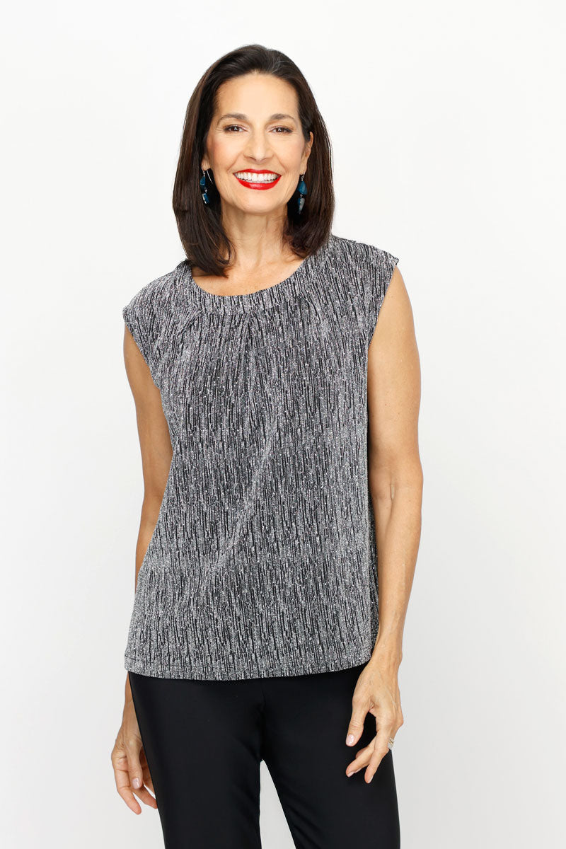 It's the season to shine! The classic tank gets dressed up in sparkling silver in the Sparkle Rhinestone Tank. Pair with the coordinating pant and jacket for a head to toe celebration, or pair with a black pant and jacket for a polished holiday look.