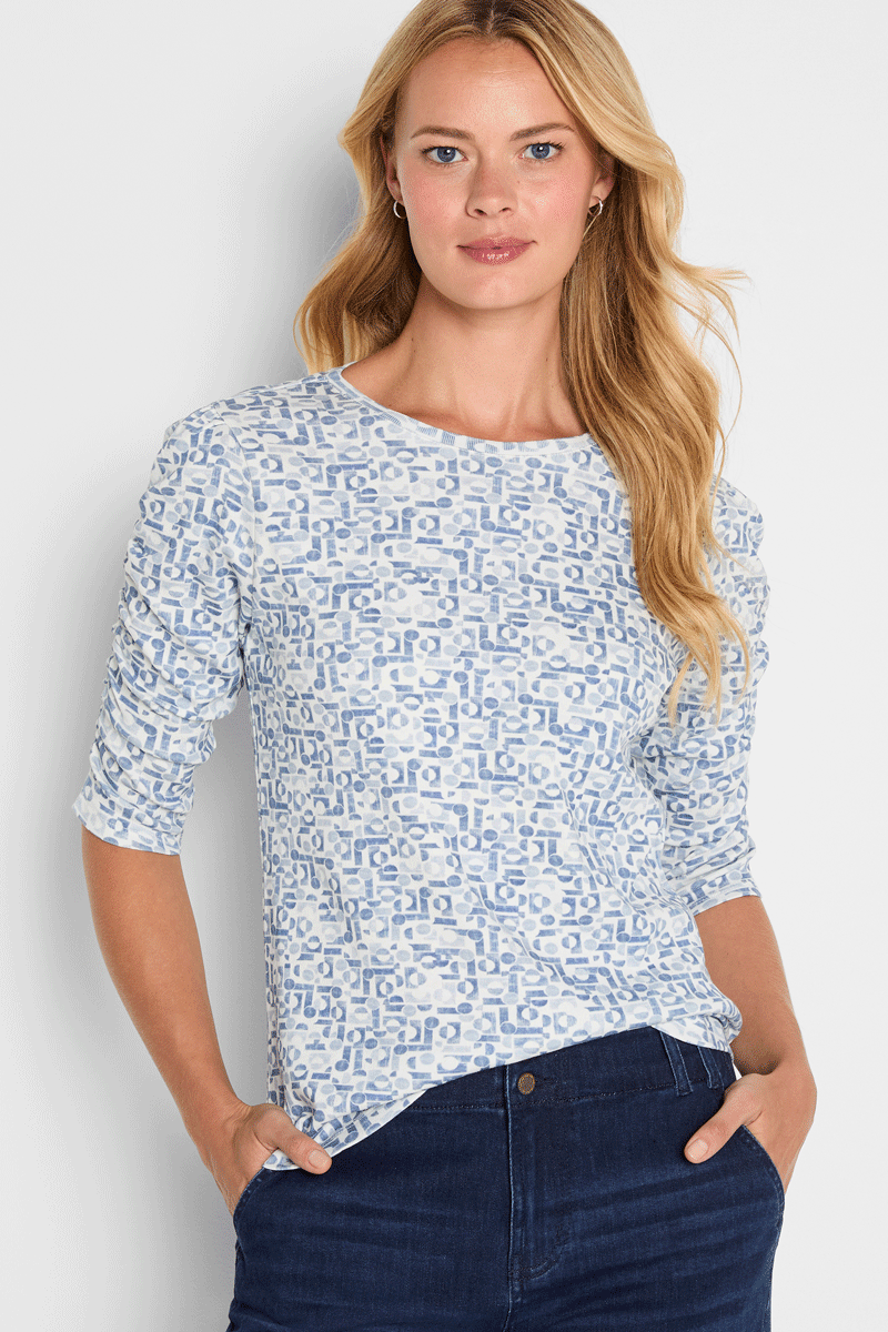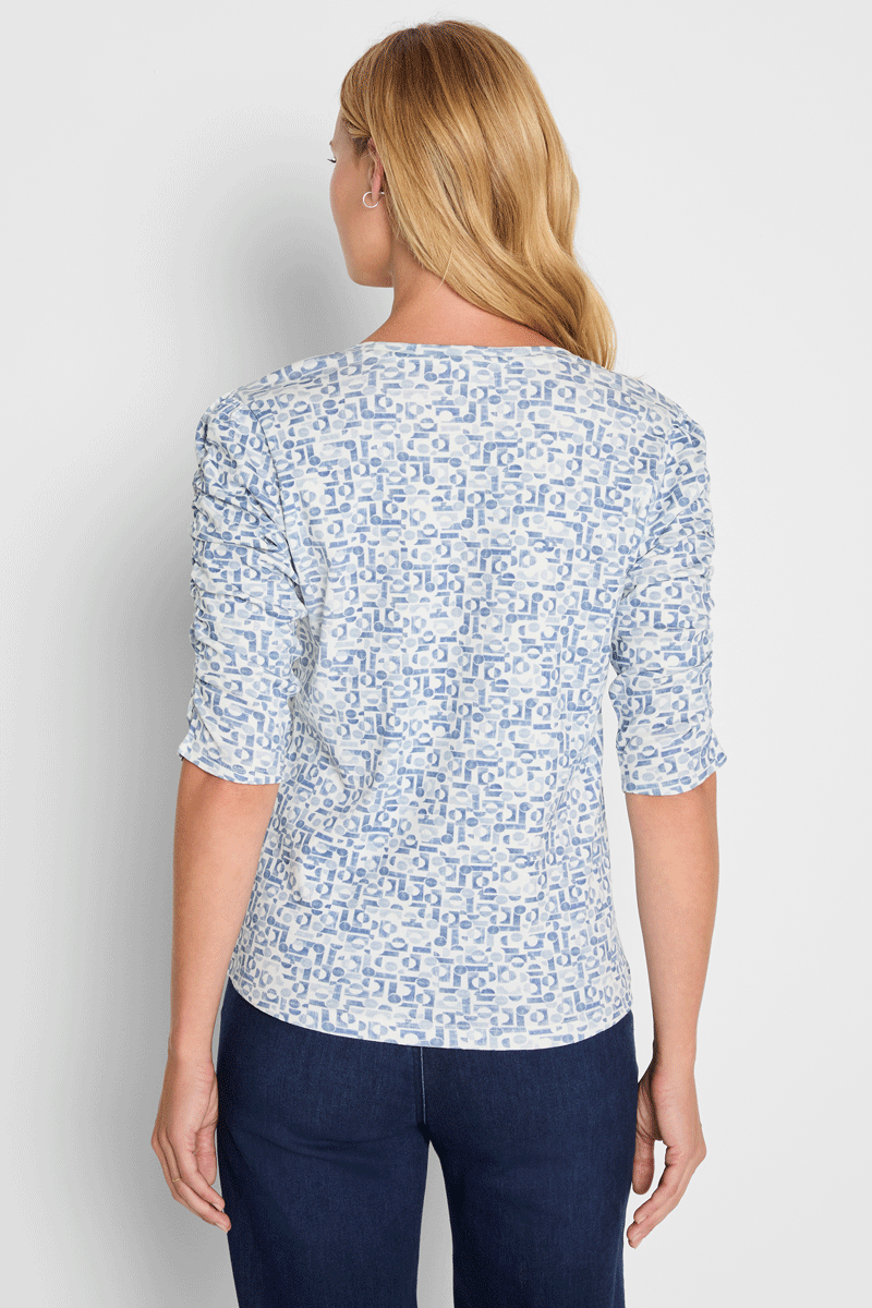 Geometric patterns meet clever design in this standout tee that refuses to blend in. The signature ruched sleeves echo the bold geo print, creating visual interest that feels intentional and fresh. It's the kind of piece that looks effortlessly put-together whether worn solo or layered under your favorite jacket—those flat-lying gathers won't bunch or shift.