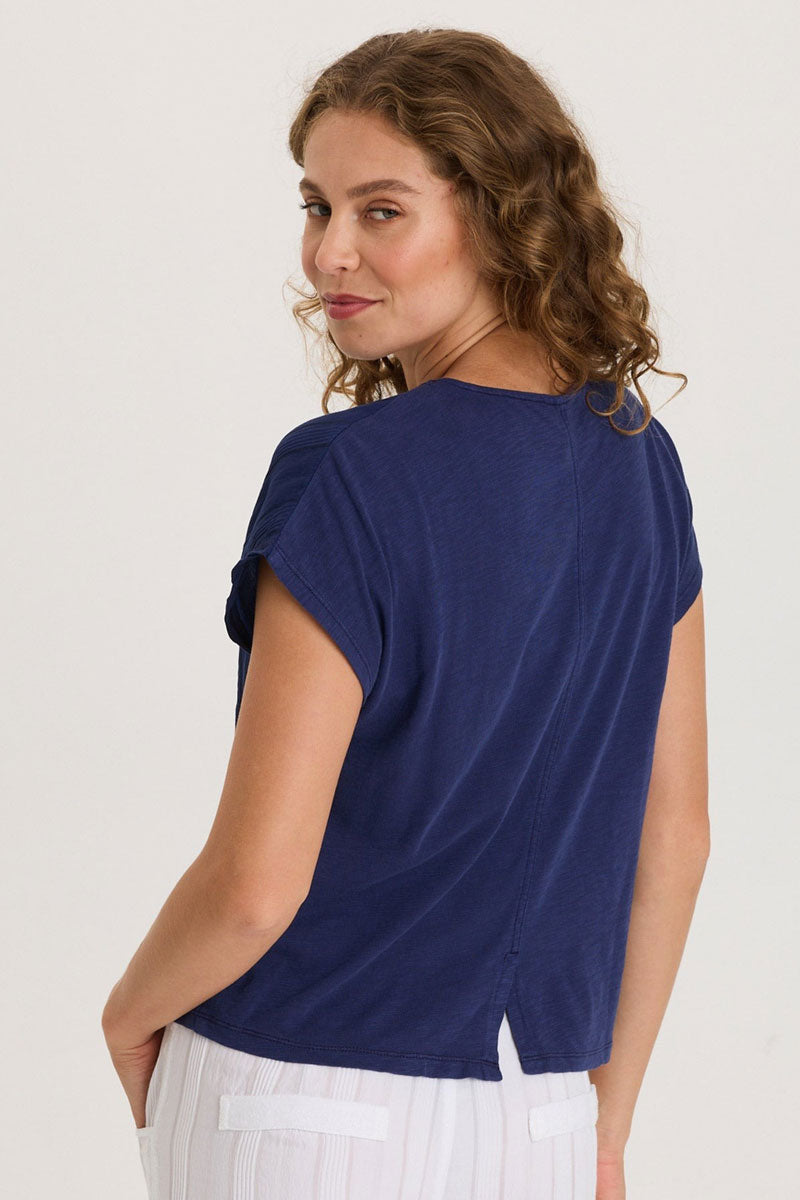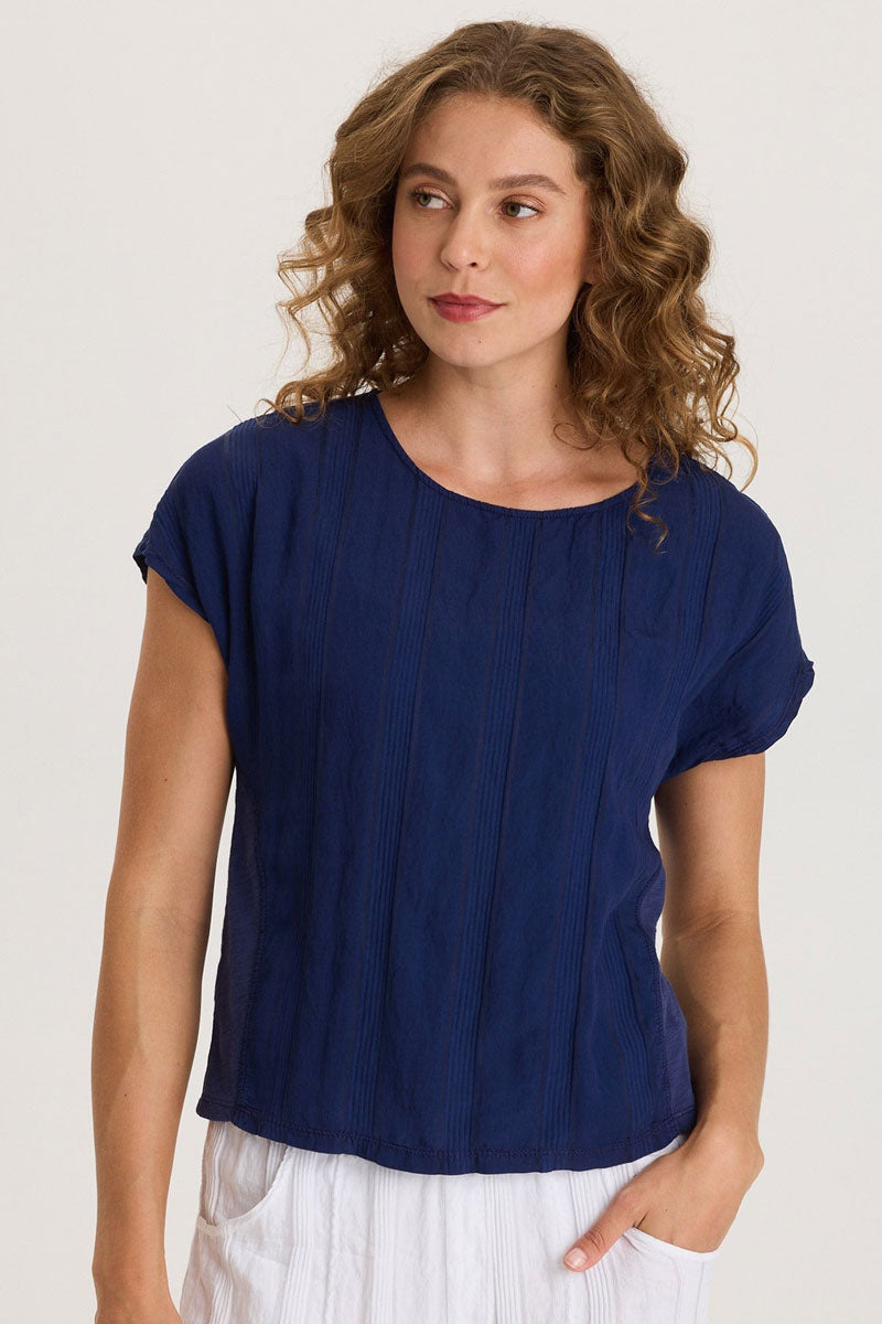 An updated classic tee, the Adgar Textured Stripe Jersey features a textured stripe woven front panel. A center seam runs down the slub jersey back and is split at the hem for ease of moment. Light and breezy, it's ready for the day on the go.