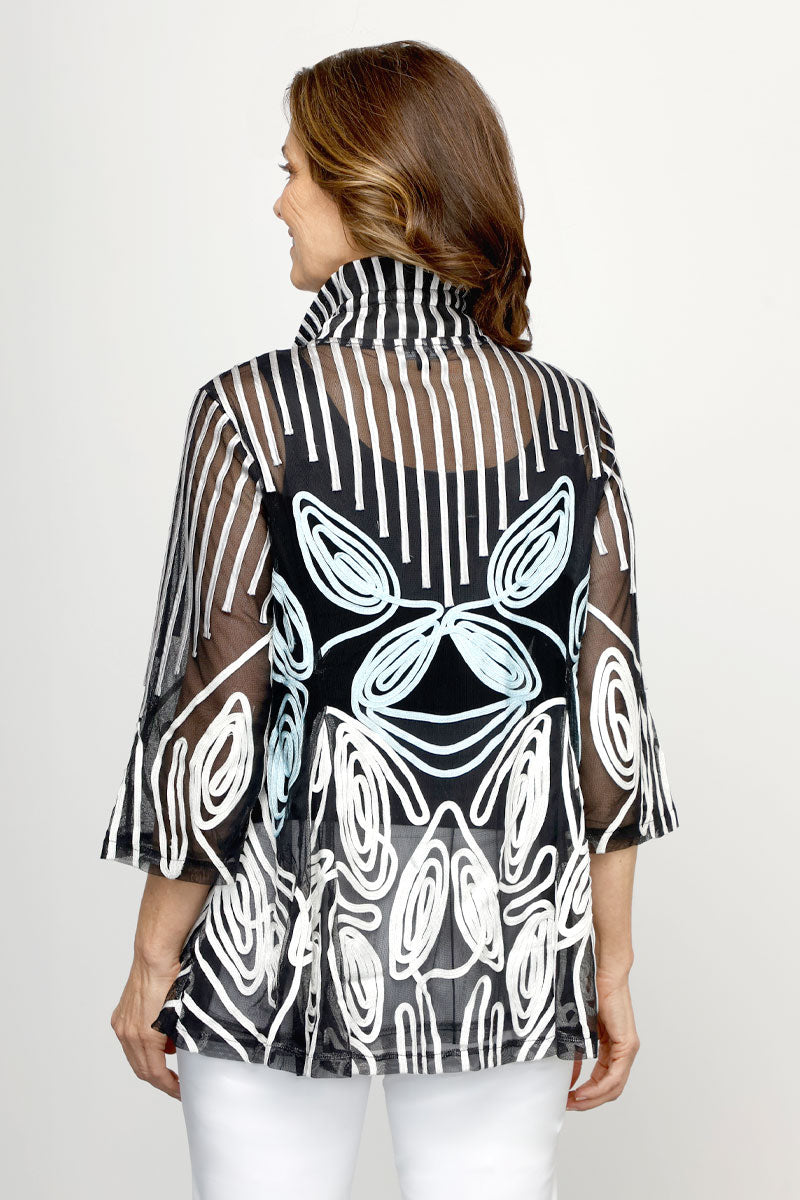 Soutache is back! This Frederique jacket is a lightweight topper that fits like a dream. The clever placement of satin and soutache ribbon on durable mesh creates an abstract geometric pattern with movement and flow. The result? A topper that feels comfortable and elegant while delivering serious style and movement.